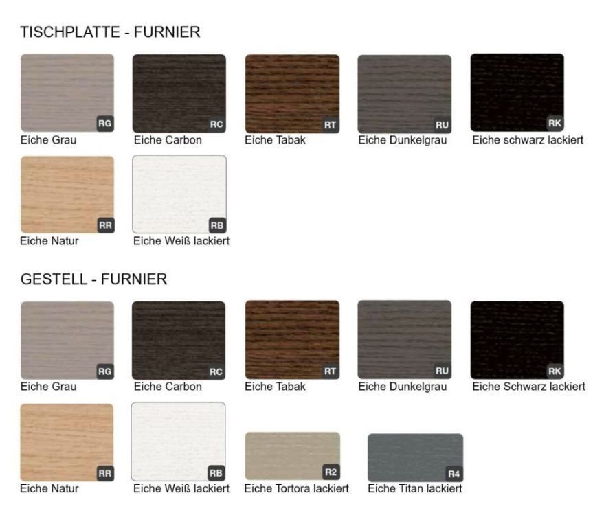 Eiche Weiß lackiert (RB), Eiche Natur (RR), Eiche Grau (RG), Eiche Dunkelgrau (RU), Eiche Carbon (RC), Eiche Tabak (RT)