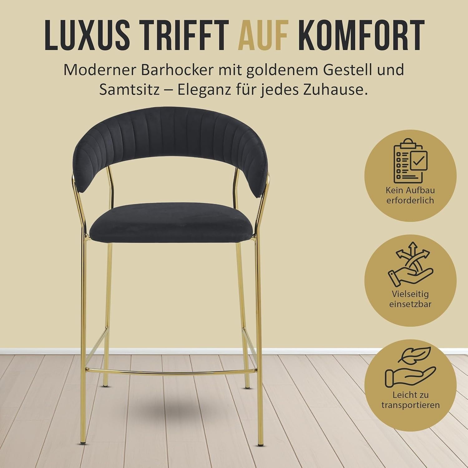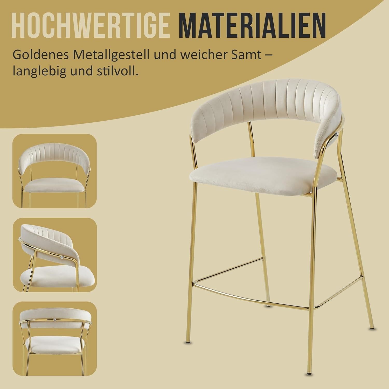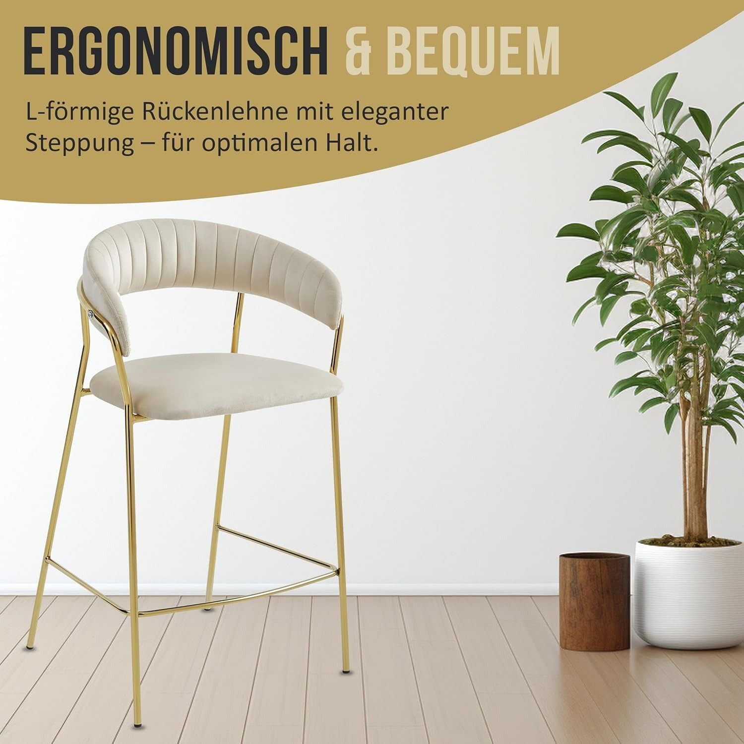 Best For Home BADIA Barhocker aus Samt, rgonomischer Stuhl mit goldenen Metallbeinen