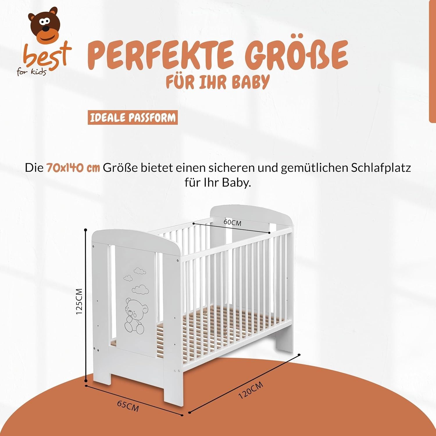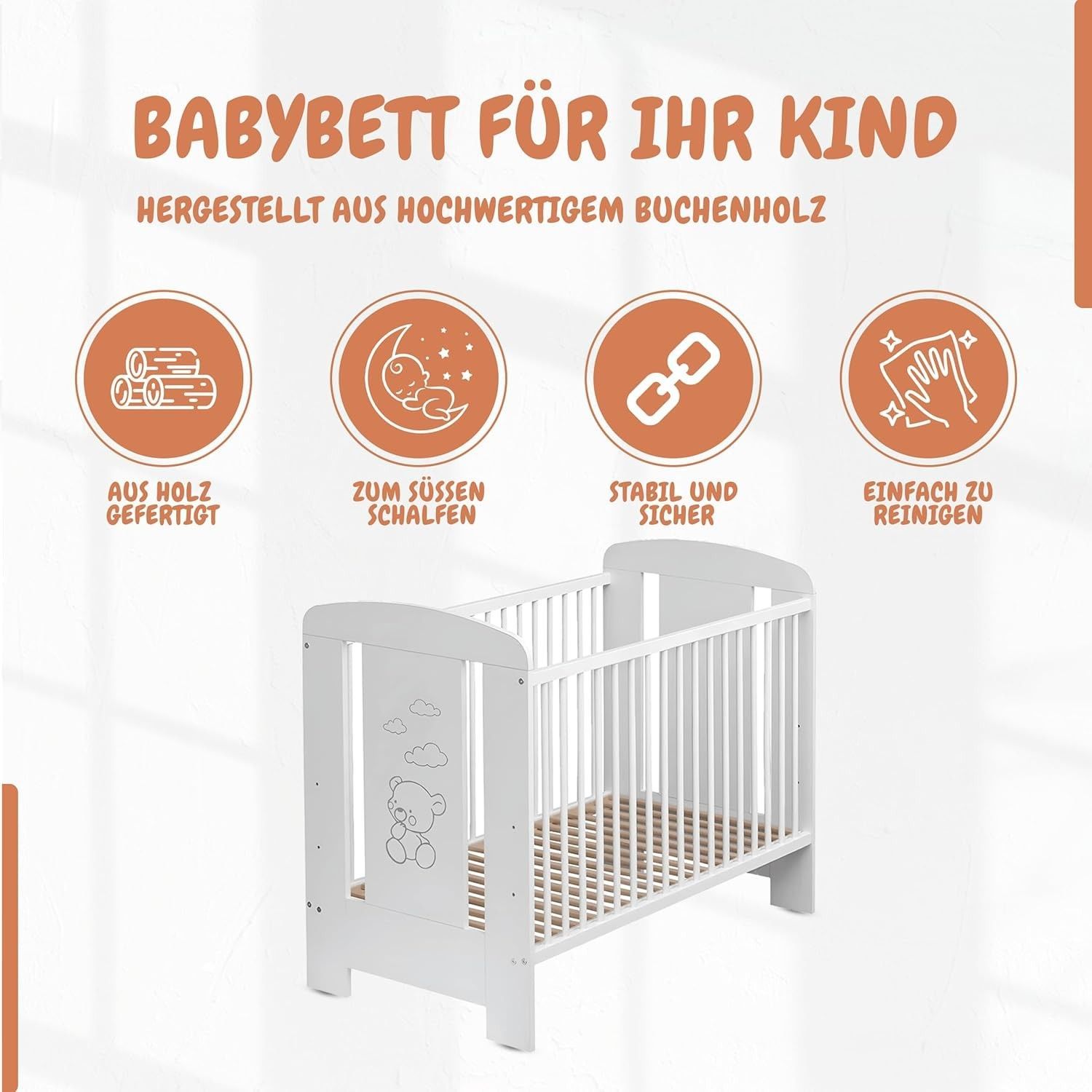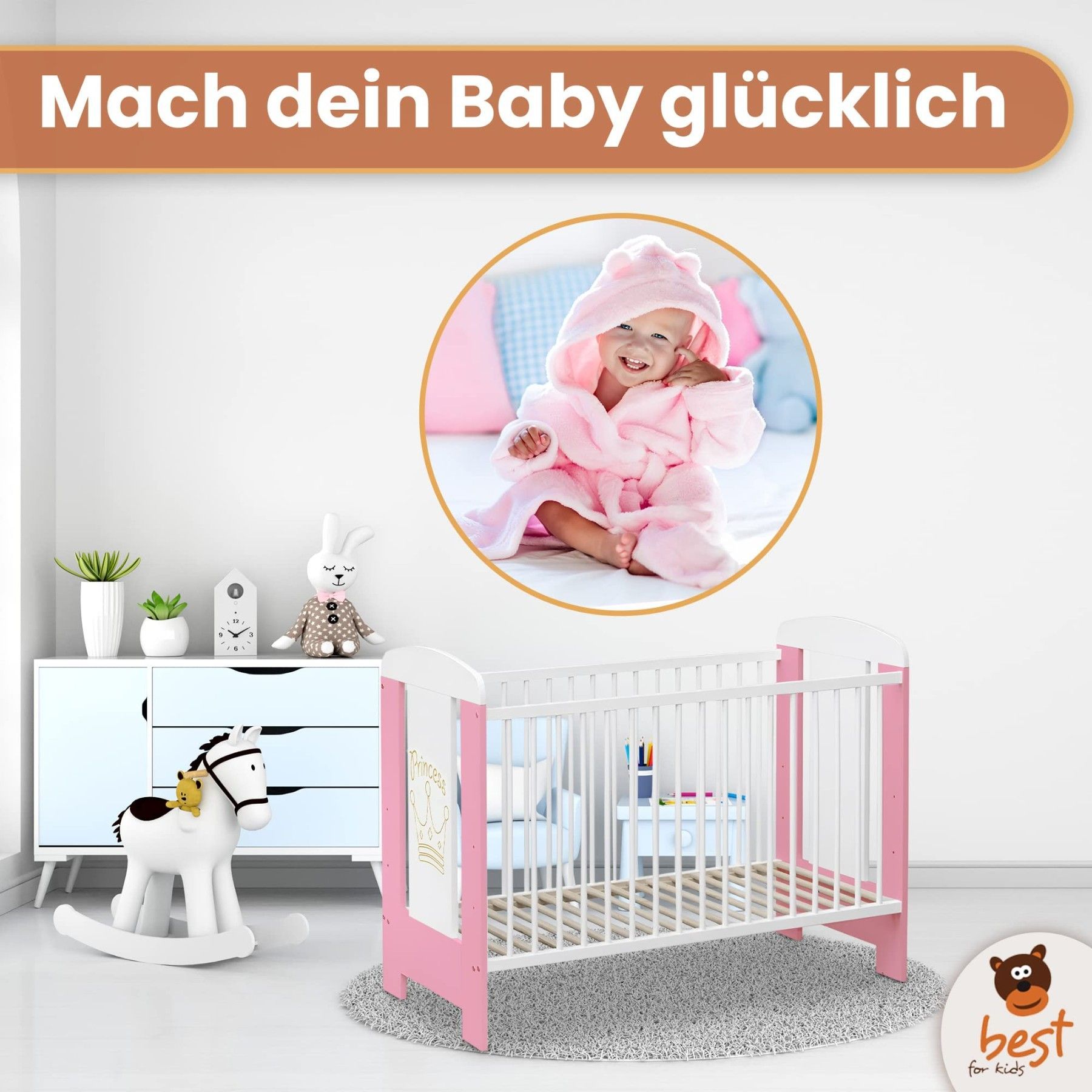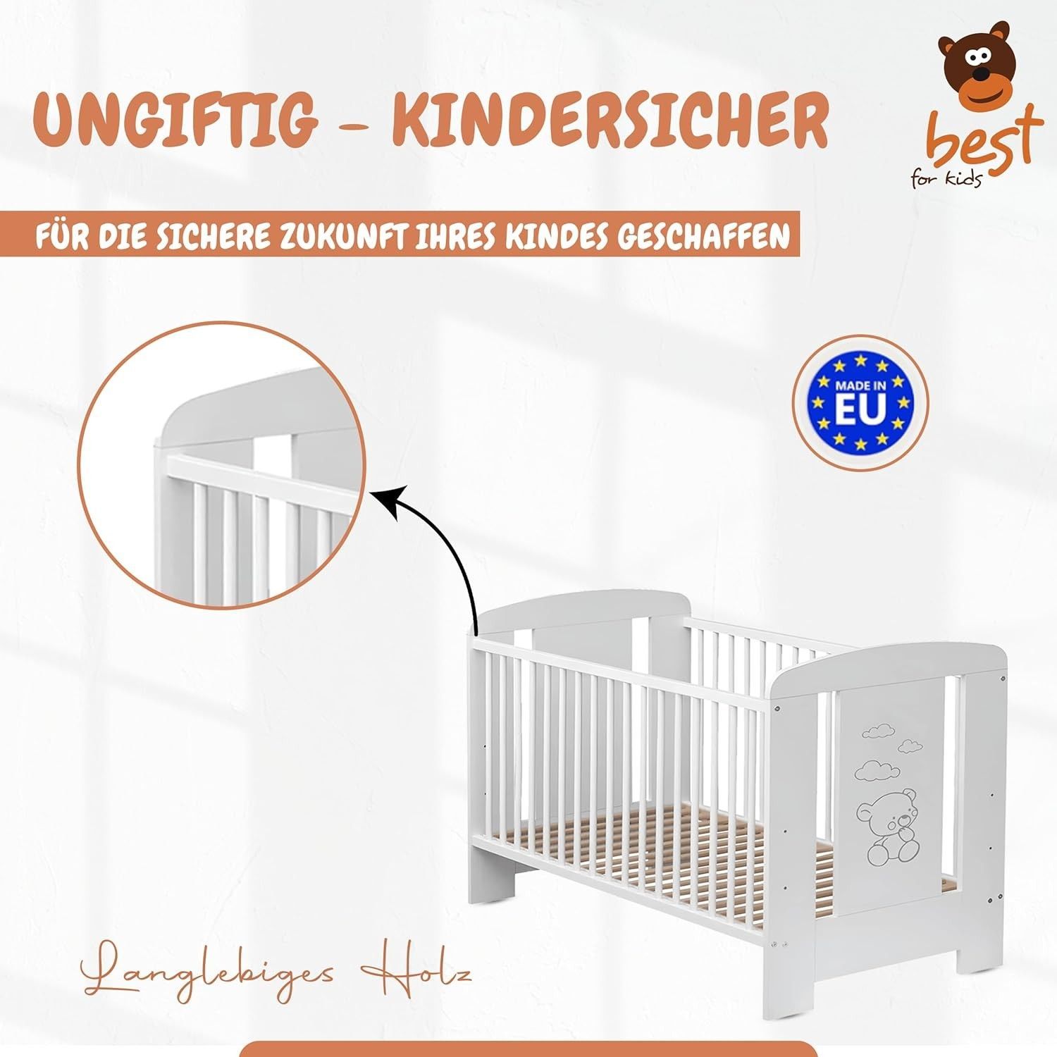 Best For Kids Babybett - Höhenverstellbar & 4-teilig mit Matratze und Schlupfsprossen