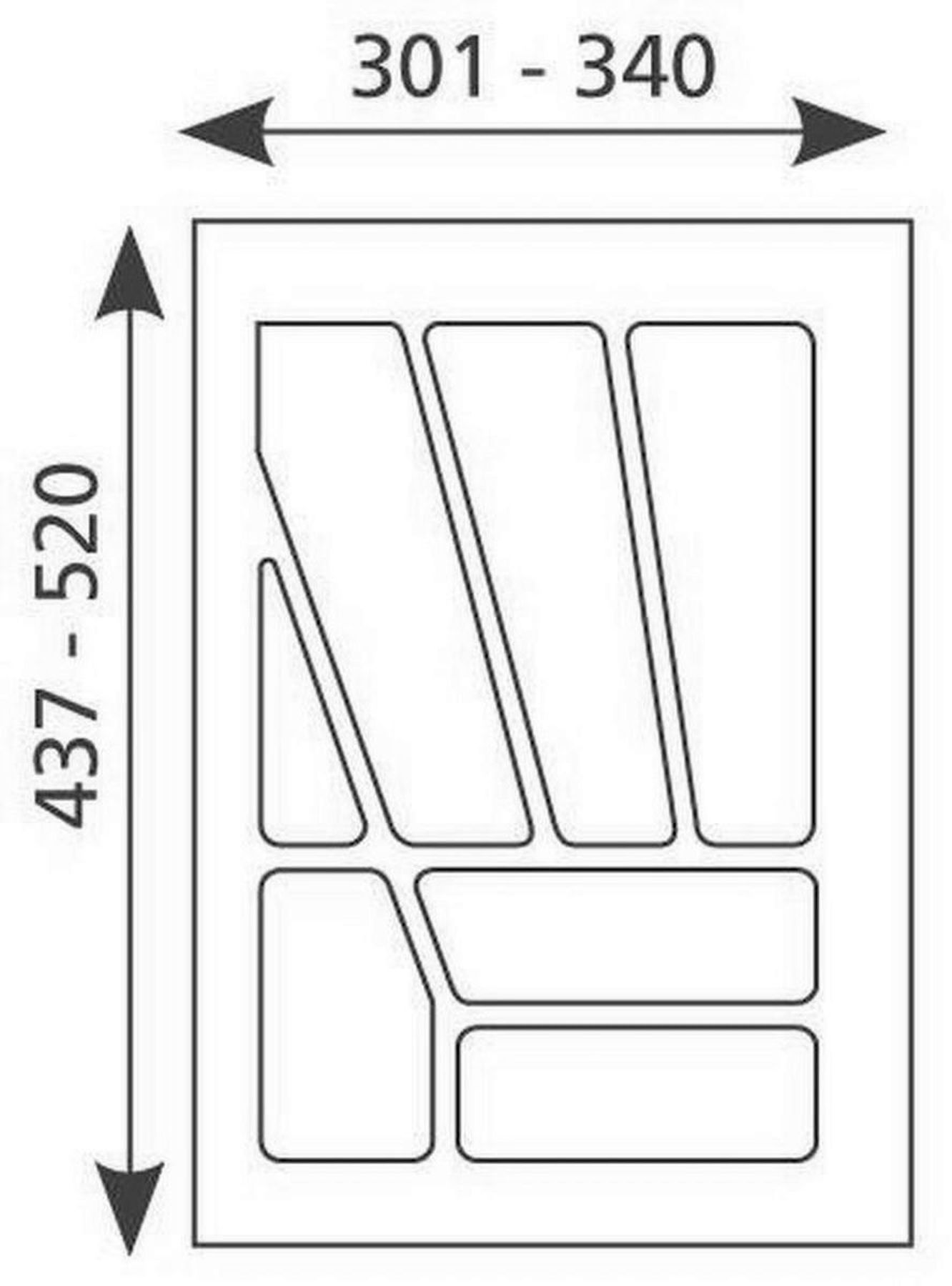 Besteckeinsatz Multi 40, Weiß oder Silber, für 40-cm-Schublade. Hochwertiger, antistatischer Kunststoff, lebensmittelecht, geruchsneutral und stabil. Raumsparende Aufteilung mit 7 Fächern. Individuell zuschneidbar innerhalb der angegebenen Maße. Lieferung gemäß Skizze und Maßangaben.