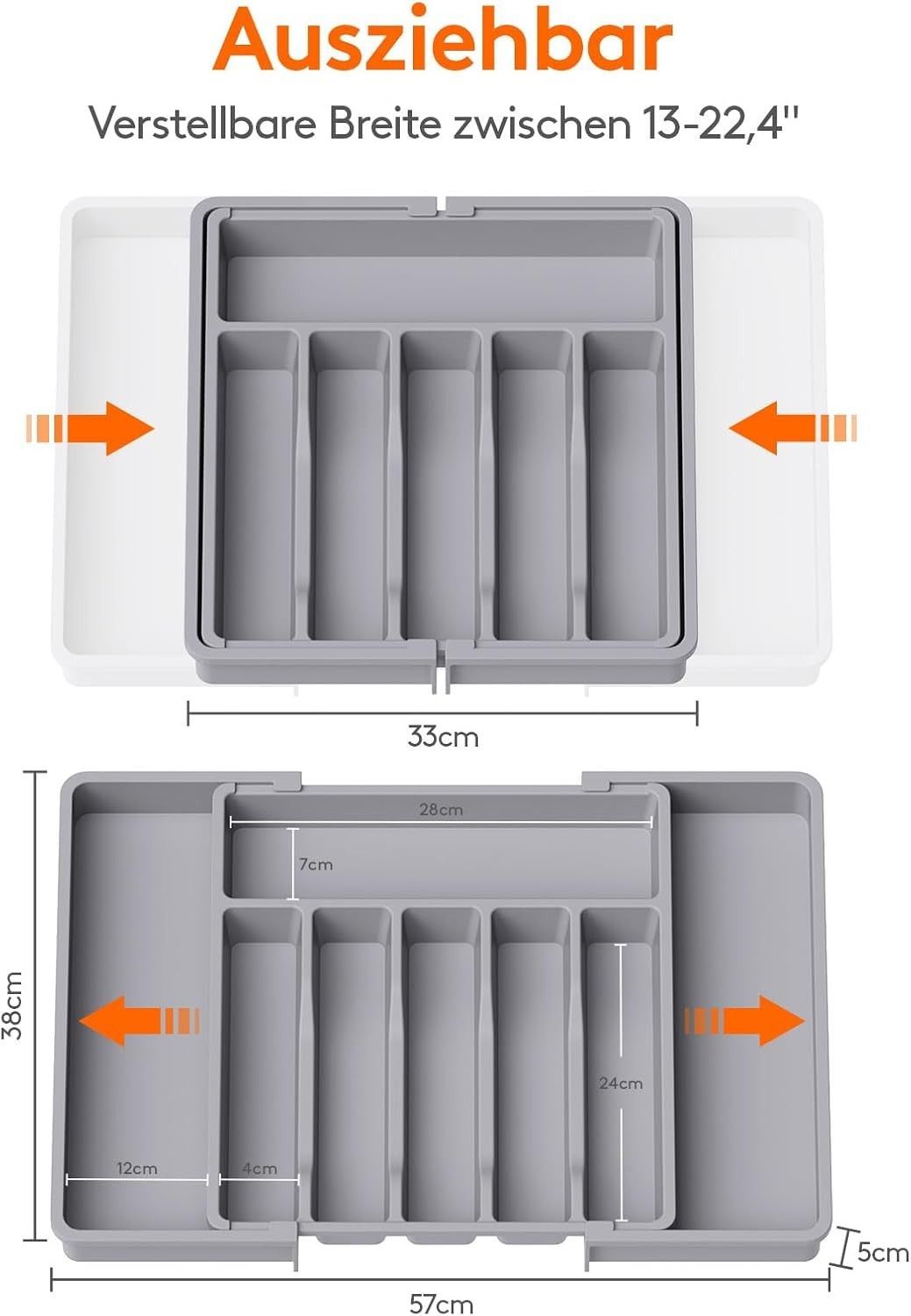 Großes Fassungsvermögen: Schaffen Sie mehr Platz auf Ihrer Küchenarbeitsplatte mit unserem Besteckkasten. Dank der zwei erweiterbaren Fächer auf der linken und rechten Seite können Sie mehr Besteck und Küchenutensilien übersichtlich verstauen. Verstellbare Größe: Mit einer anpassbaren Breite von 33