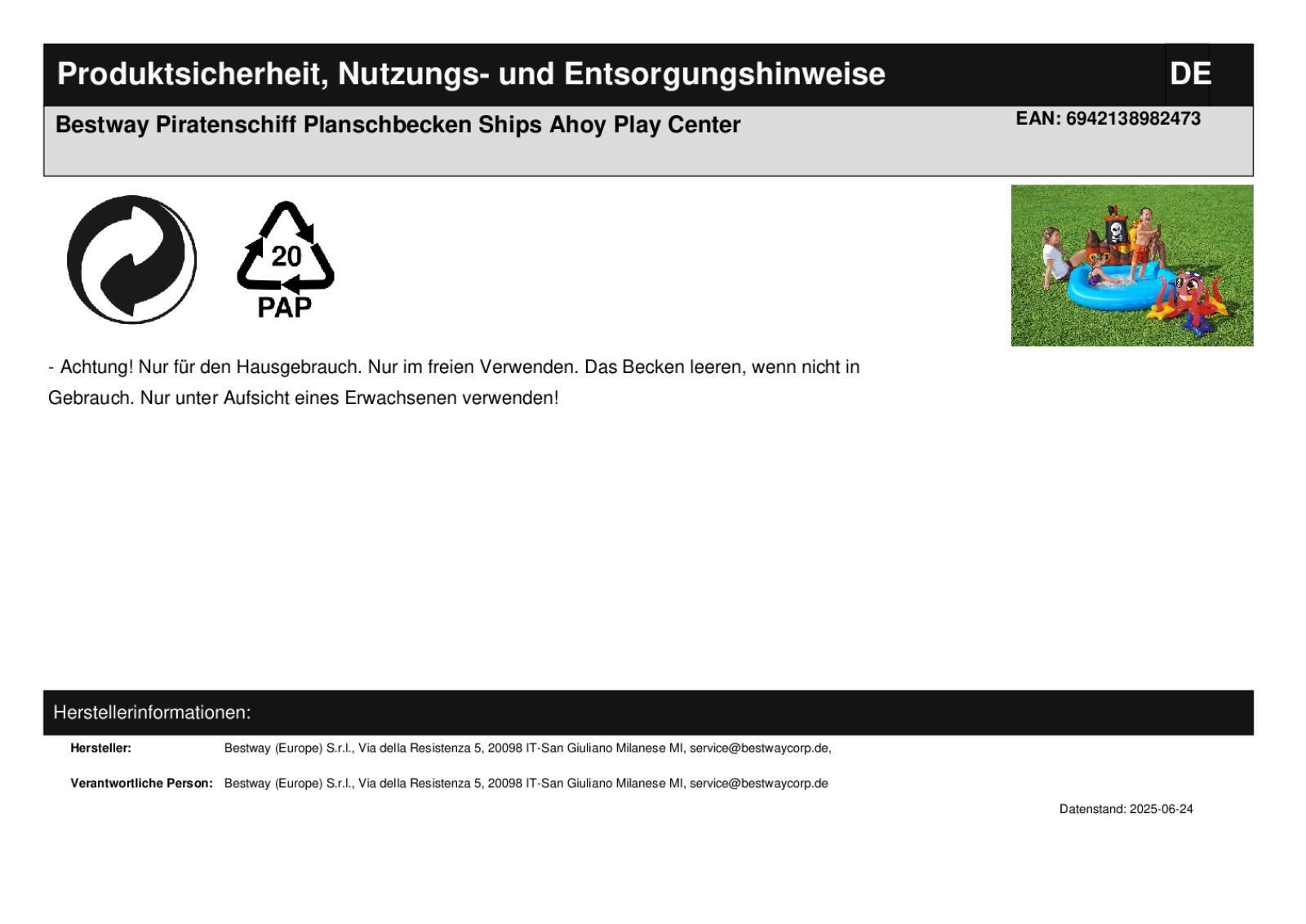• Achtung! Nur für den Hausgebrauch. Nur im freien Verwenden. Das Becken leeren, wenn nicht in Gebrauch. Nur unter Aufsicht eines Erwachsenen verwenden!