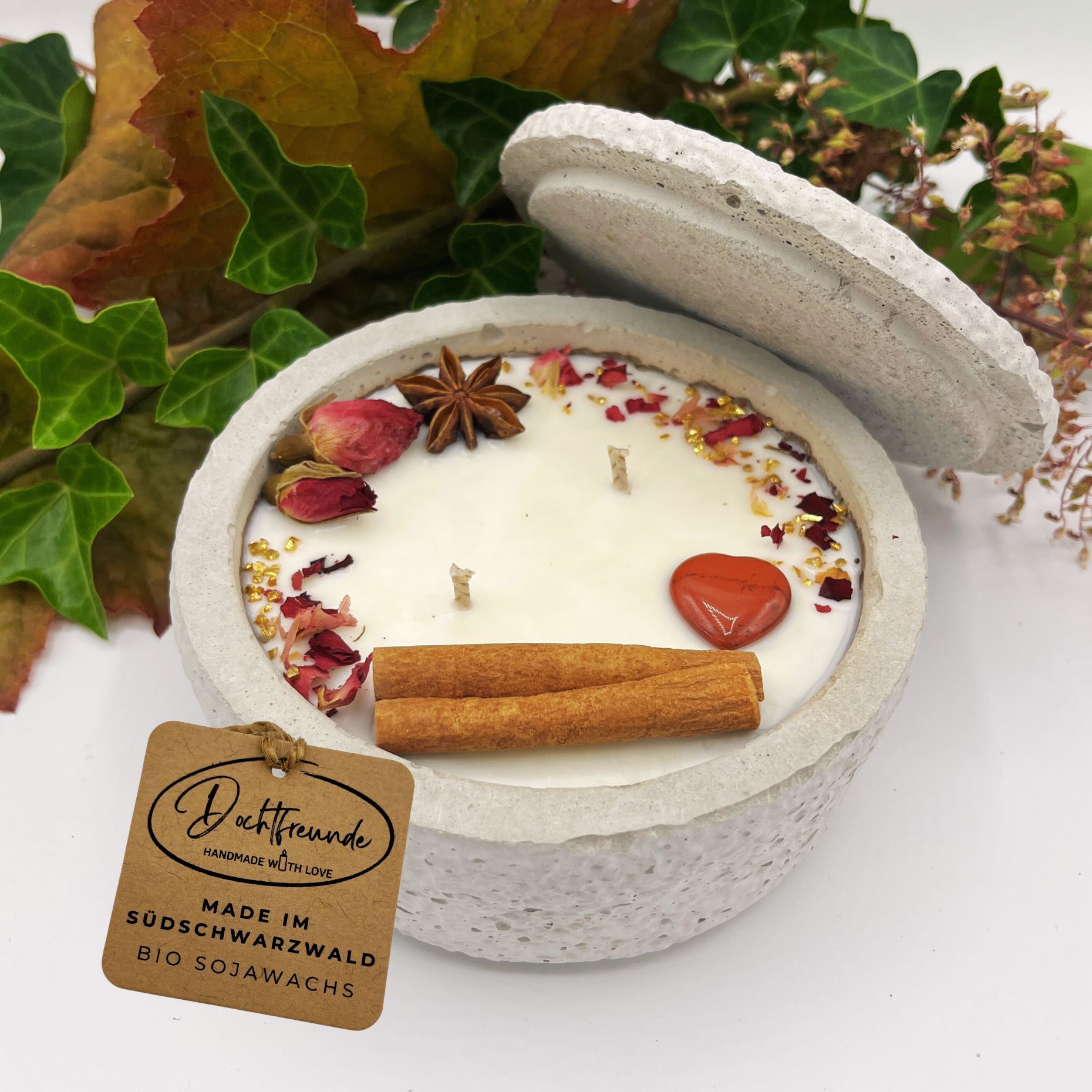 Schützen Sie die Kerze vor direkten Wettereinflüssen, um ihre Qualität zu erhalten, insbesondere bei Outdoor-Nutzung. Produktdetails Material: Veganes Sojawachs, versiegelter Beton, Baumwolldocht, getrocknete Blüten Gewicht: Ca. >0,75 kg inkl. Deckel / Endgewicht mit Wachs >1,00 kgÂ