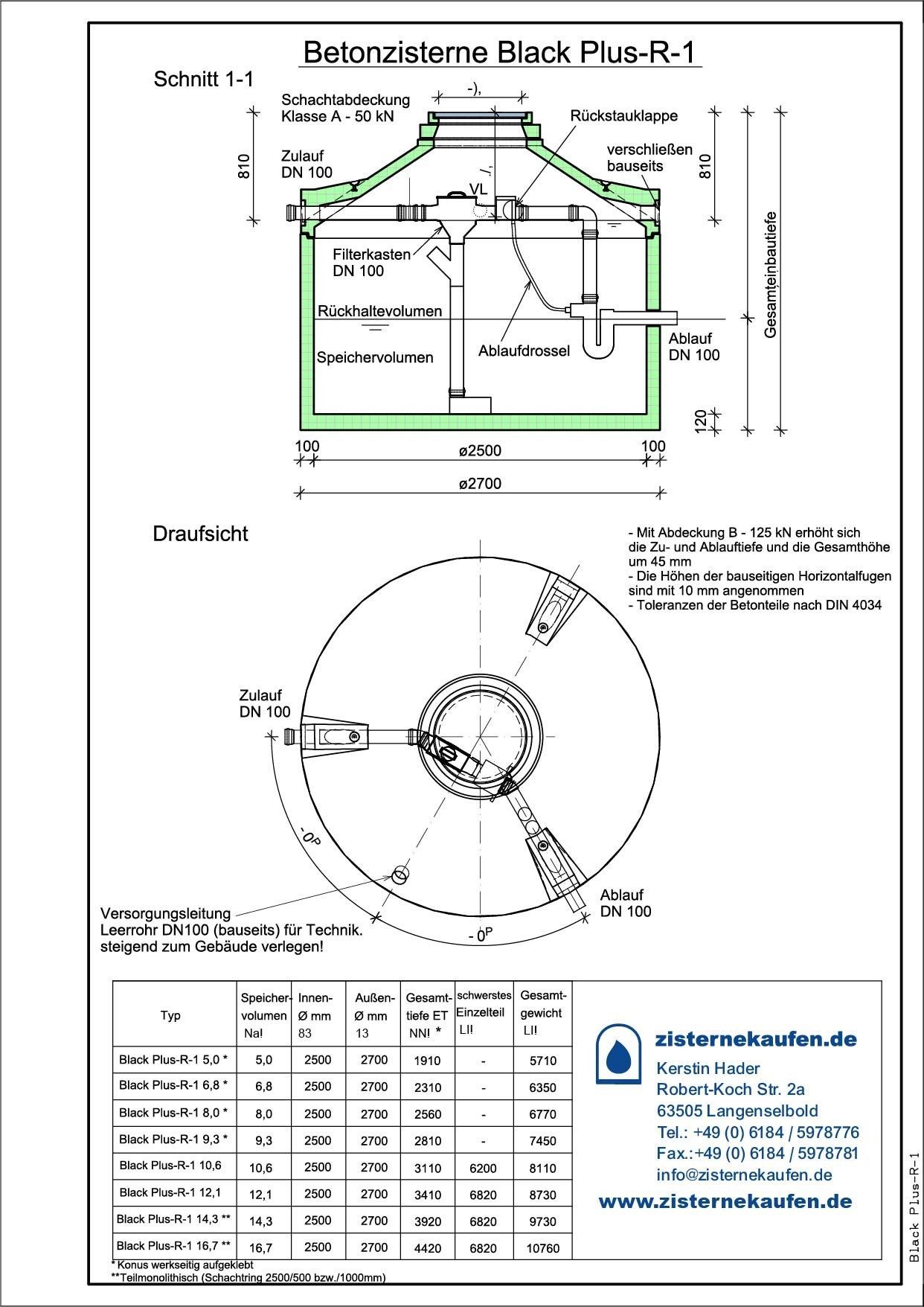 Betonzisterne Black Plus Retention Dachfläche bis 320 m² Unsere Betonzisternen haben eine Wand- Bodenstärke von 9-12 12 cm und sind aus Beton der Kl C35 45 d.h. wasserundurchlässig gefertigt. Die Zisterne ist monolithisch aufgebaut und der Konus ist bereits mit dem Grundbehälter verbunden, so d