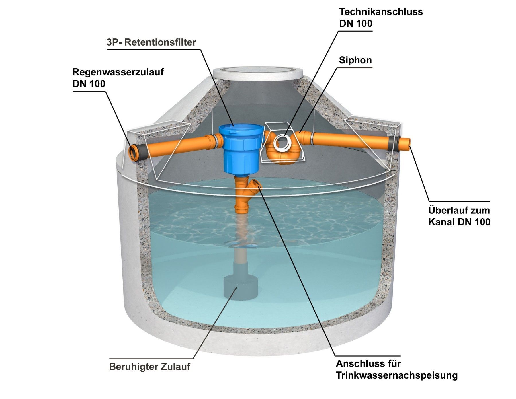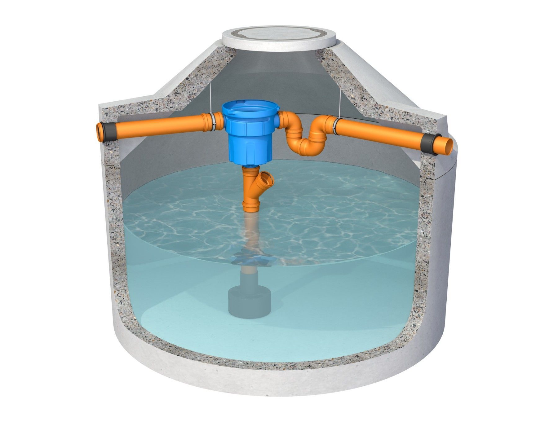 Betonzisterne Blue Unsere Betonzisternen haben eine Wand- Bodenstärke von 9-12 12 cm und sind aus Beton der Kl C35 45 d.h. wasserundurchlässig gefertigt. Die Zisterne ist monolithisch aufgebaut und der Konus ist bereits mit dem Grundbehälter verbunden, so dass zusätzliche Betonarbeiten (vermörteln d