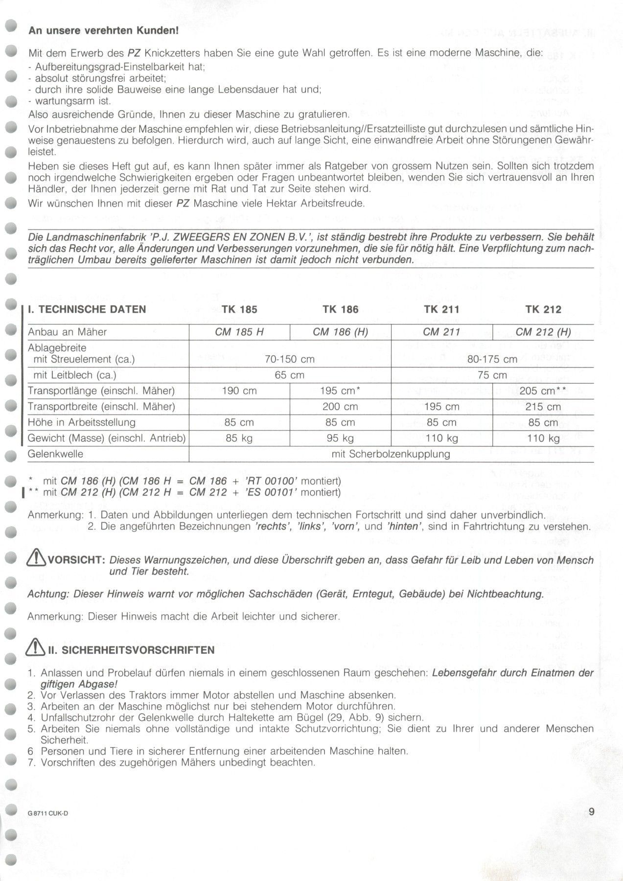 • Betriebsanleitung Ersatzteilliste PZ Zweegers Mähwerk Rotormäher CM 210