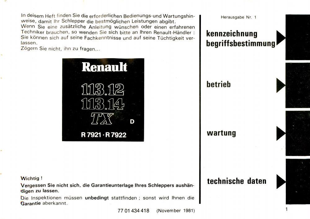 Renault Betriebsanleitung für die Renault Traktoren 113-12 TX + 113-14 TX (R7921 R7922)