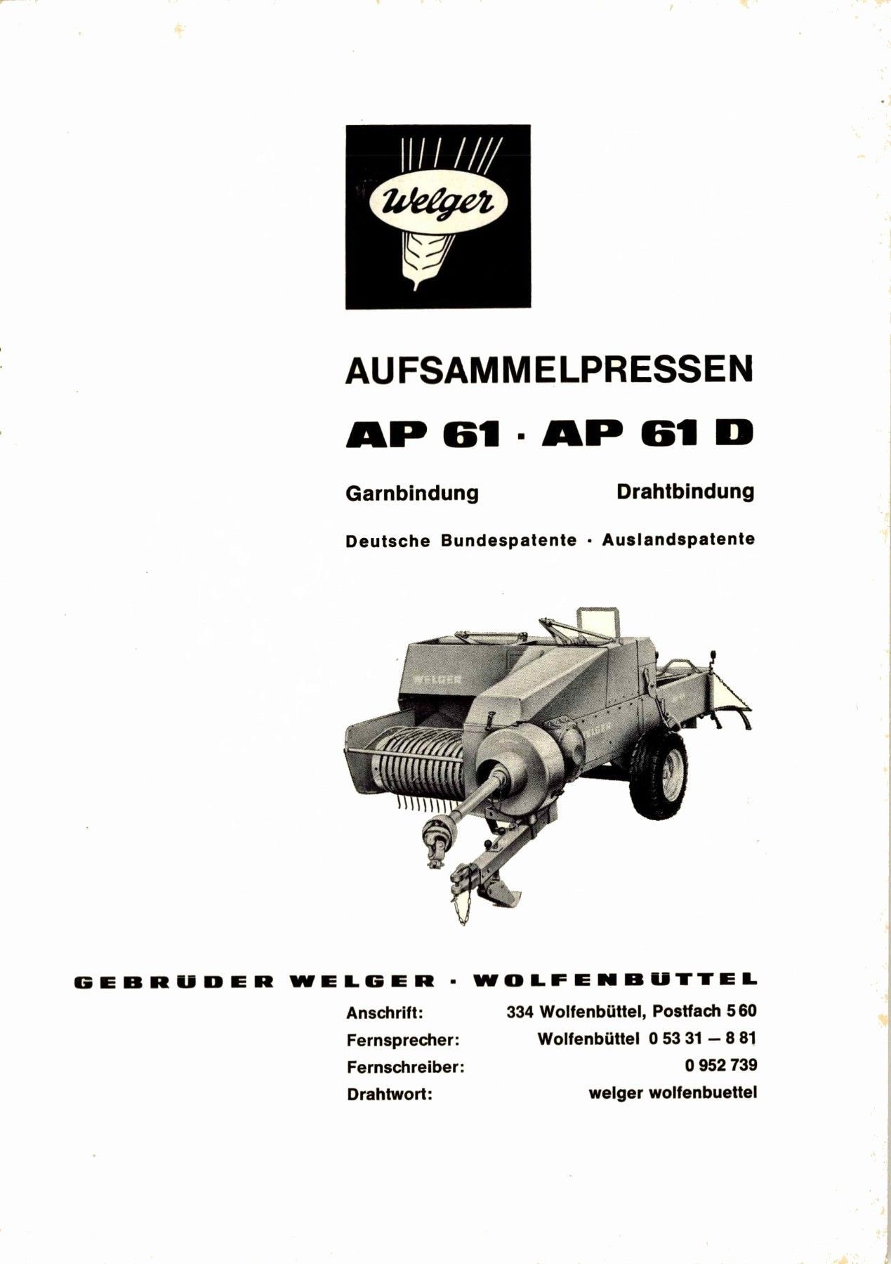Betriebsanleitung für die Welger AP 61 u. AP 61 D Aufsammelpresse