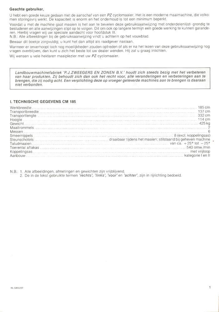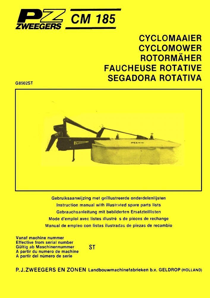 Betriebsanleitung und Ersatzteilliste für das PZ Zweegers Mähwerk Rotormäher CM 185