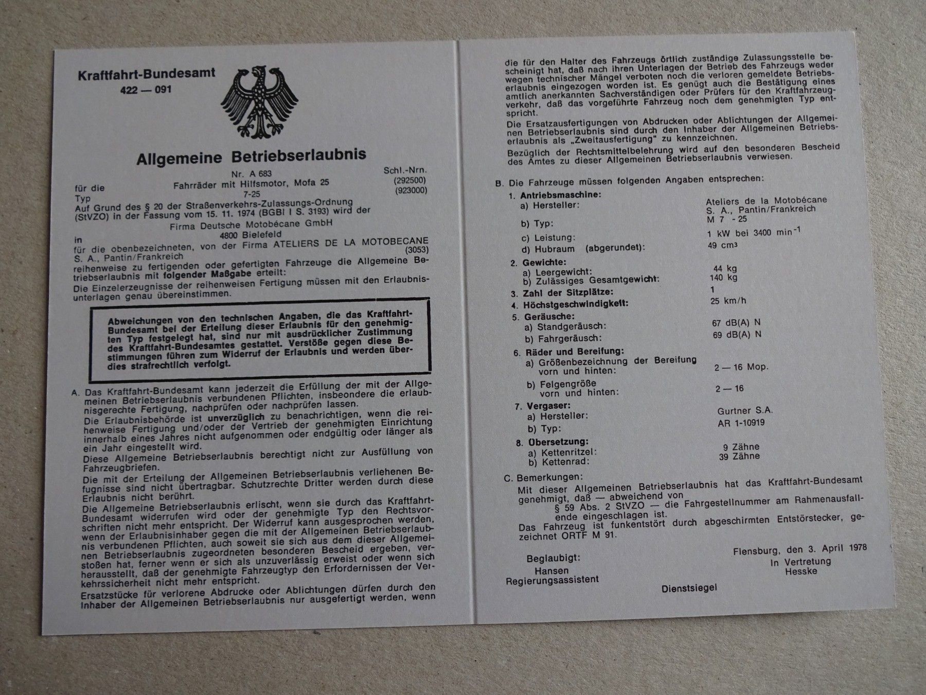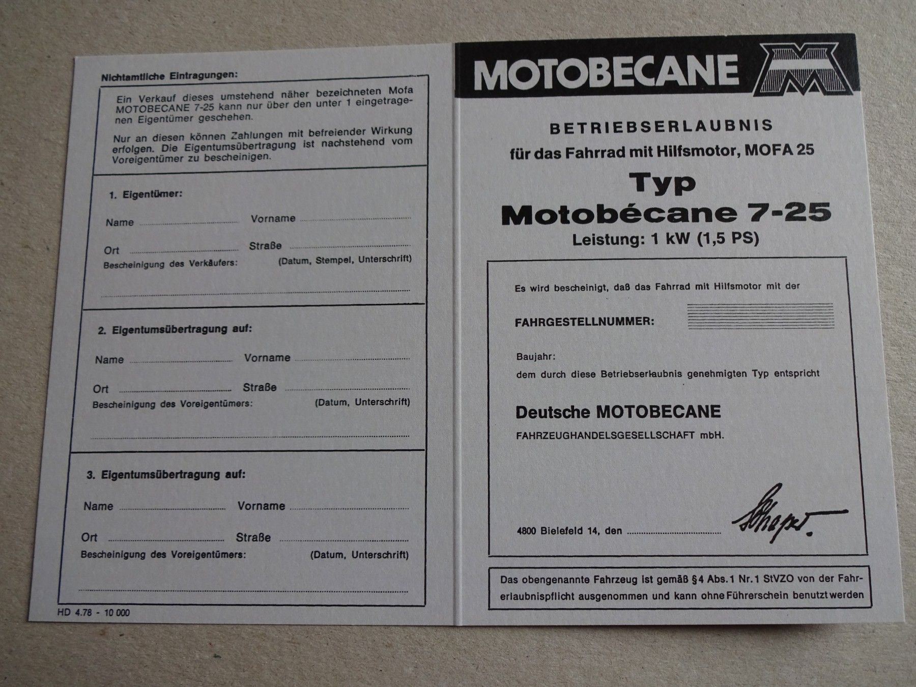 unbenutzte ABE Motobecane 7-25 Mofa Fahrrad mit Hilfsmotor als INFO Datenblatt für Sammlerzwecke Spezielles Karton Papier für Sammler... Mehr