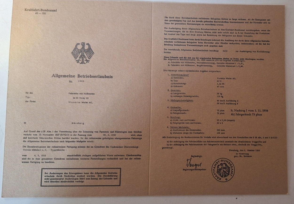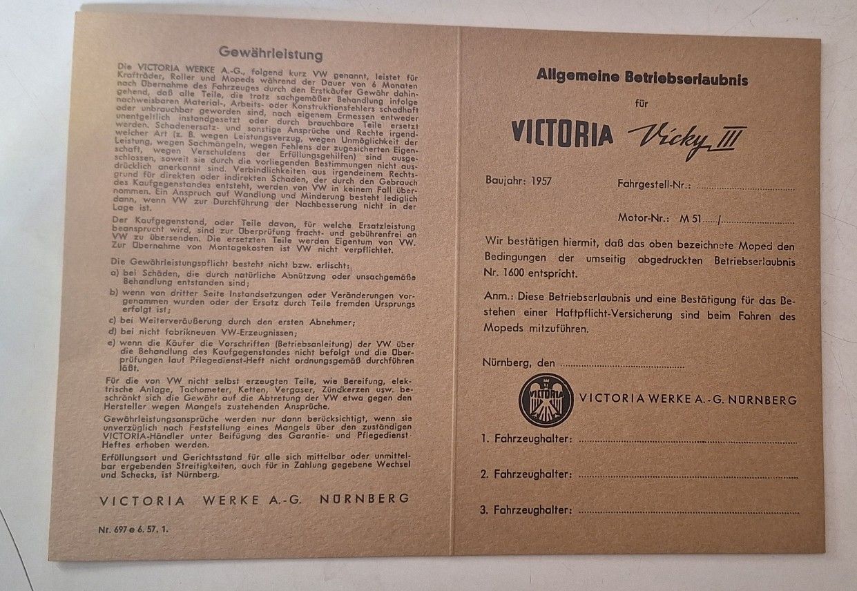unbenutzte Betriebserlaubnis ABE VICTORIA M 52 Vicky III Fahrrad mit Hilfsmotor Datenblatt als INFO Datenblatt für Sammlerzwecke Karton Papier für Sammler... Mehr