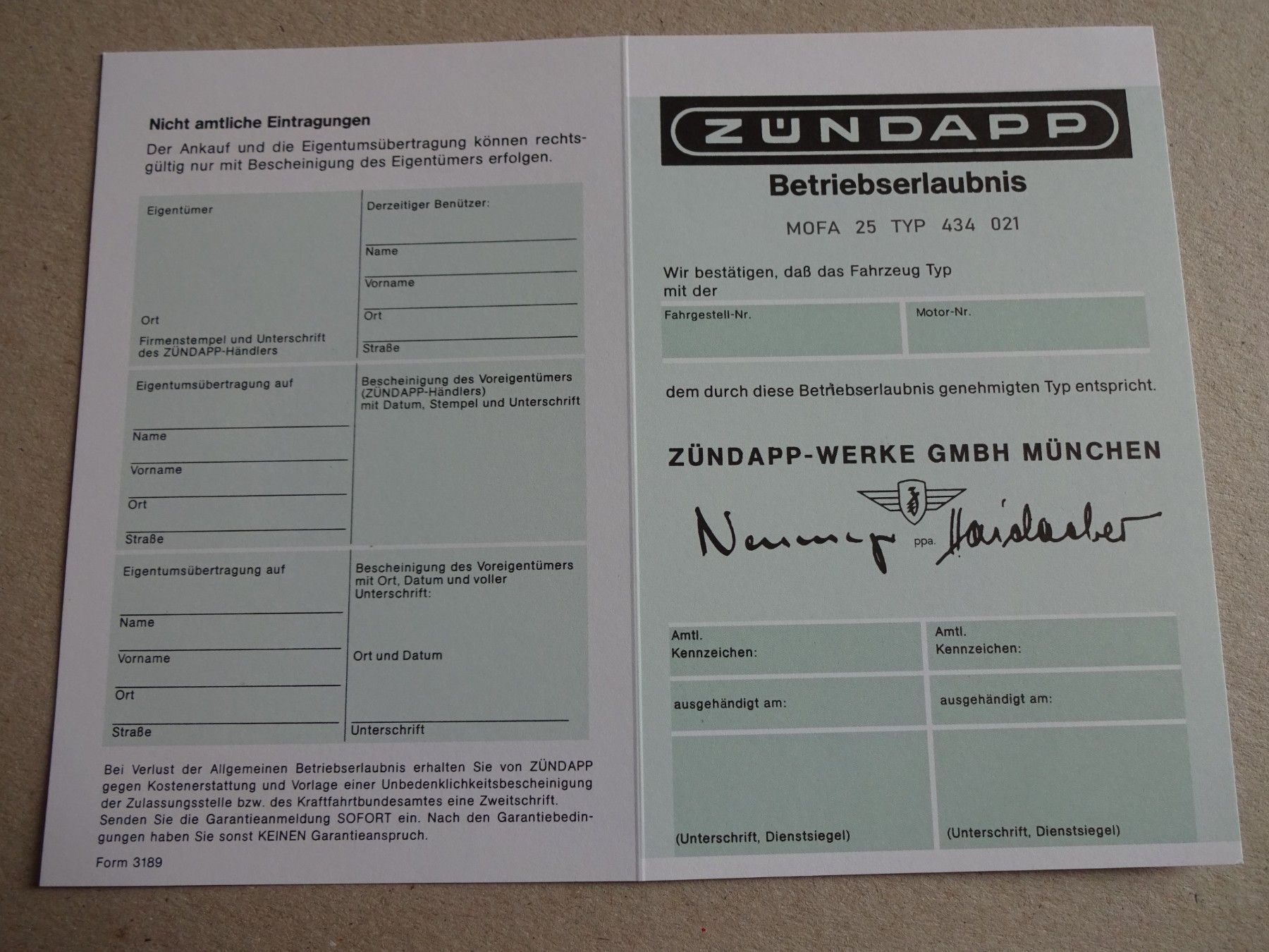 Betriebserlaubnis ABE Zündapp Mofa 25 Typ 434 021 Datenblatt