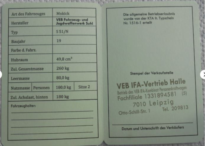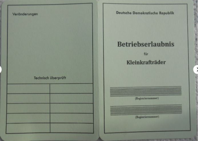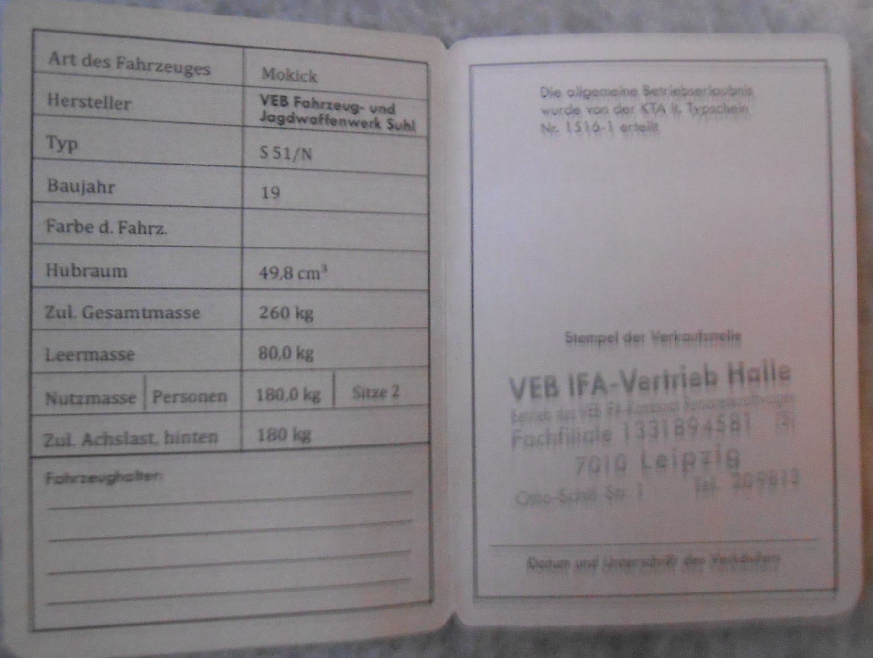 Betriebserlaubnis für Kleinkrafträder mit Stempel , Simson, S51N