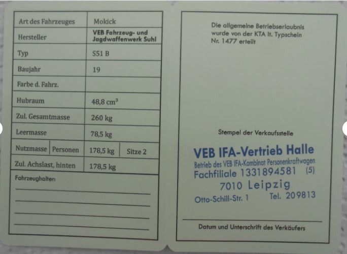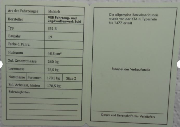 Betriebserlaubnis für S51B, Simson, DDR, Oldtimer
