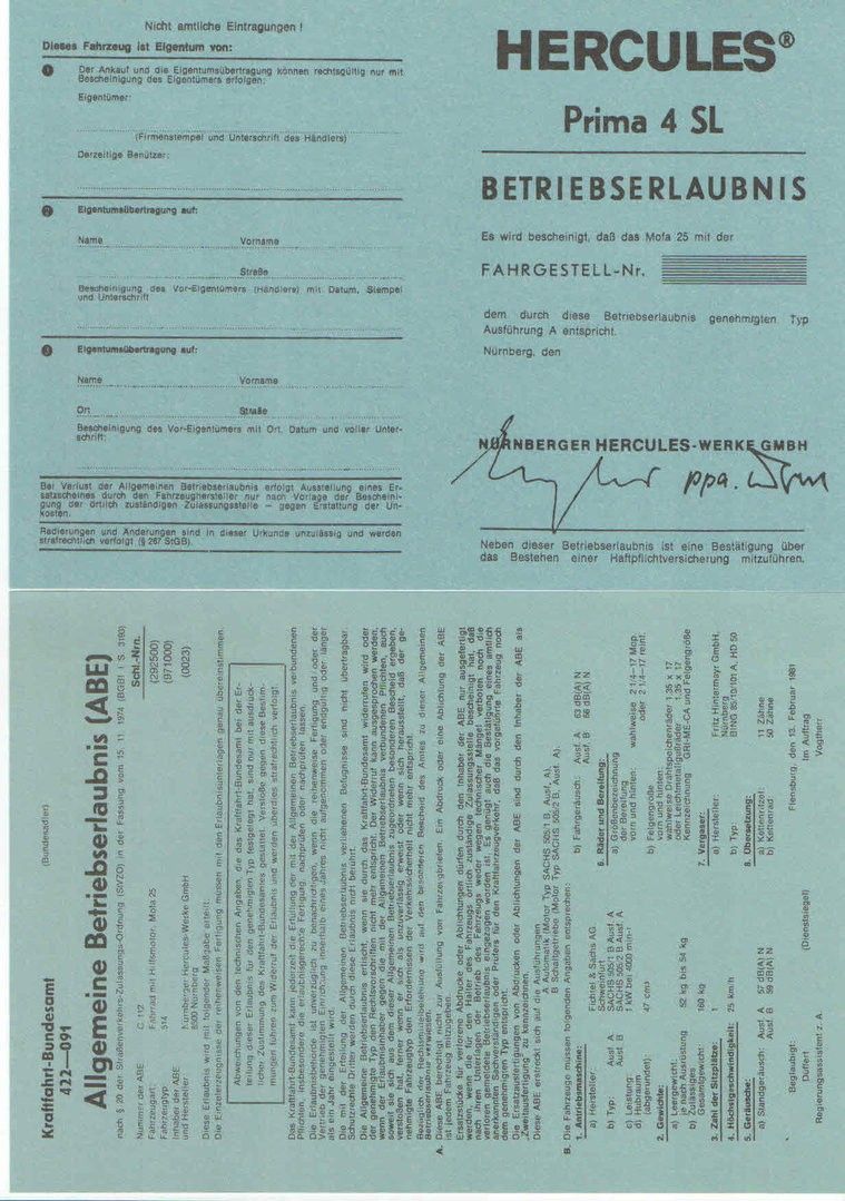 Hercules Betriebserlaubnis Hercules 4SL Mofa, ABE, Papiere, Blanko