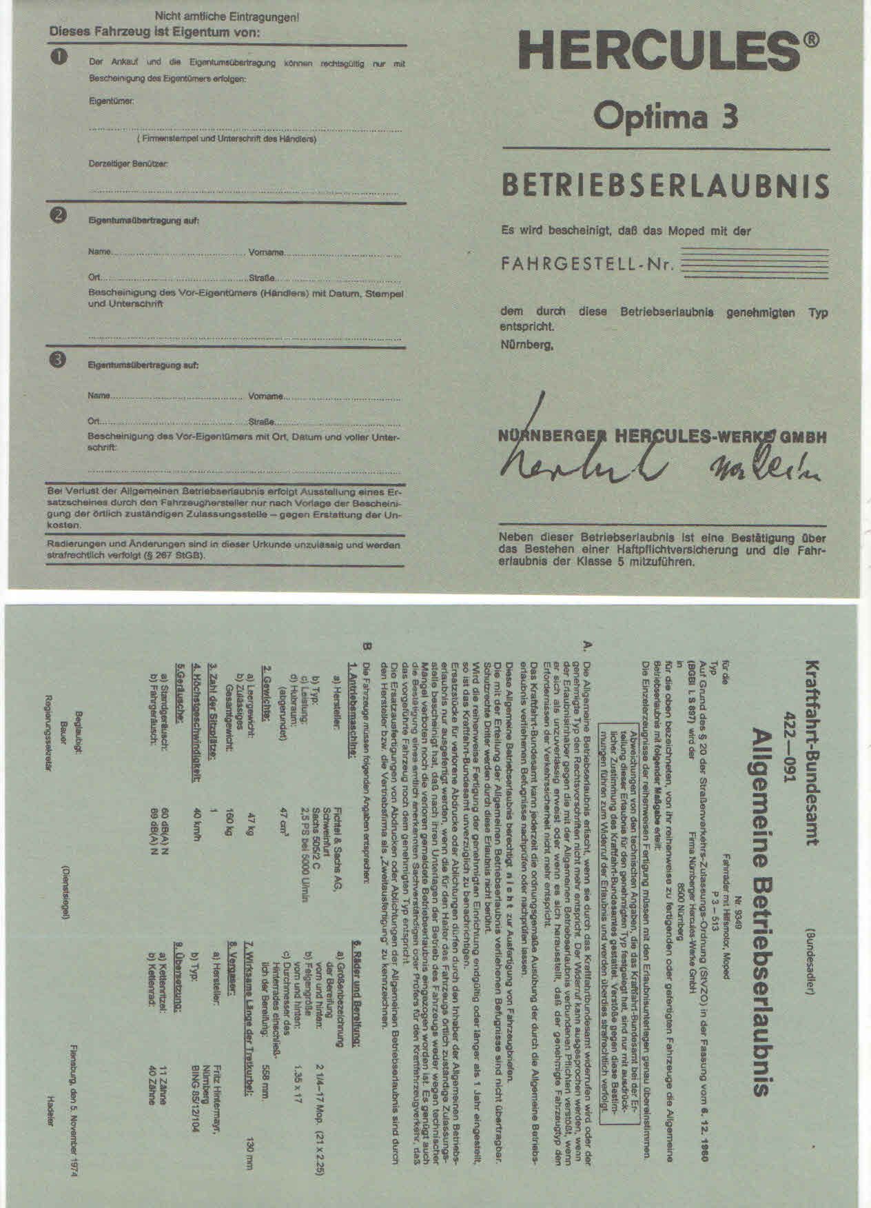 Hercules Betriebserlaubnis Hercules Optima 3, Mofa, Kleinkraftrad, Oldtimer