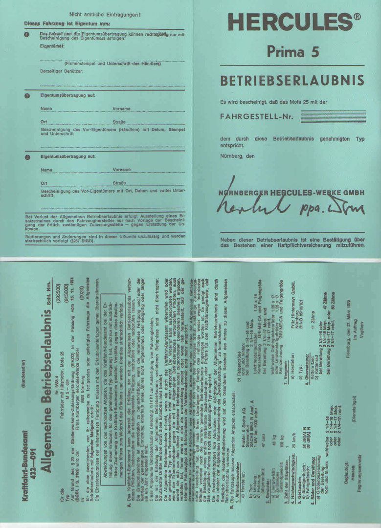 Hercules Betriebserlaubnis Hercules Prima 5 Mofa , Blanko, ABE, Oldtimer