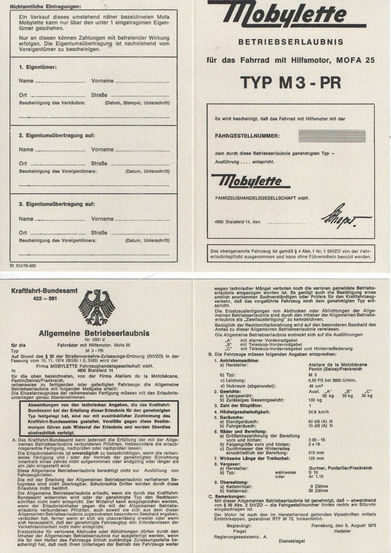 Betriebserlaubnis Mobylette Typ M3-PR, M3 PR, PRT, PRTS, PTRTSG, Caddy