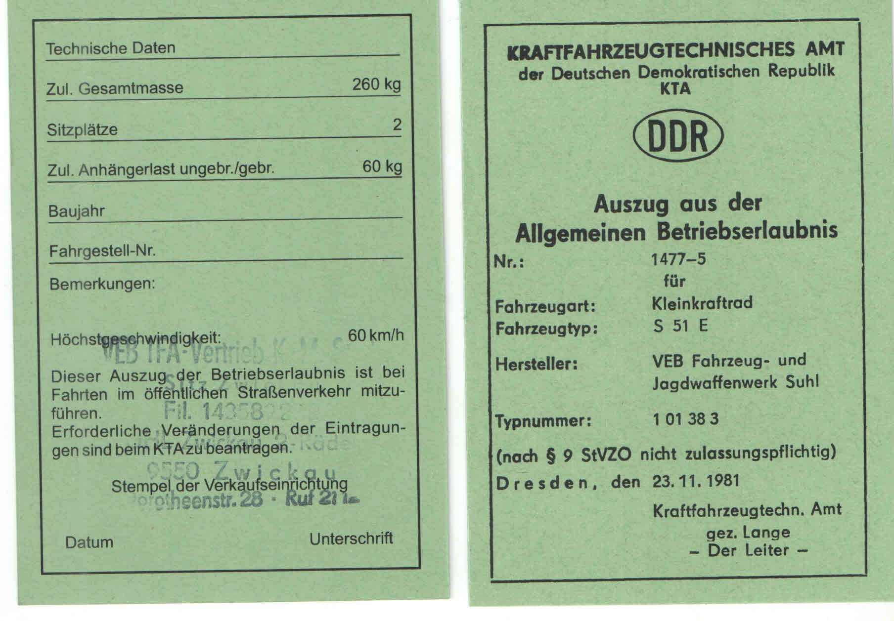 Betriebserlaubnis Simson Kleinkraftrad S 51E, ABE, Papiere