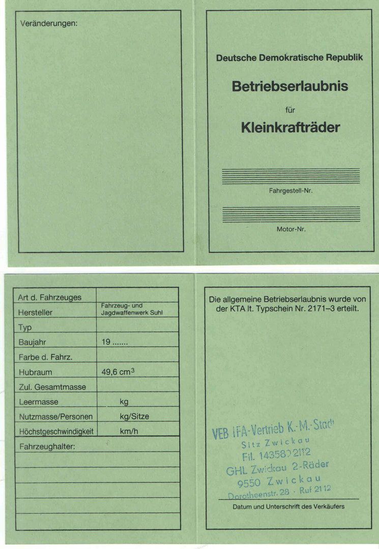 Betriebserlaubnis SIMSON S 50, Blanko, IFA Papiere, Ost Moped, DDR Oldtimer