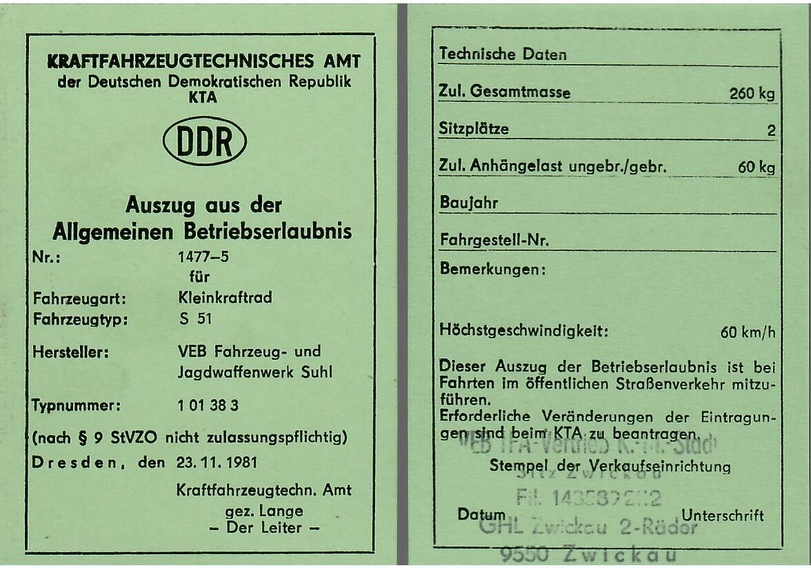 Betriebserlaubnis Simson S 51 Kleinkraftrad, ABE, Papiere, DDR Oldtimer