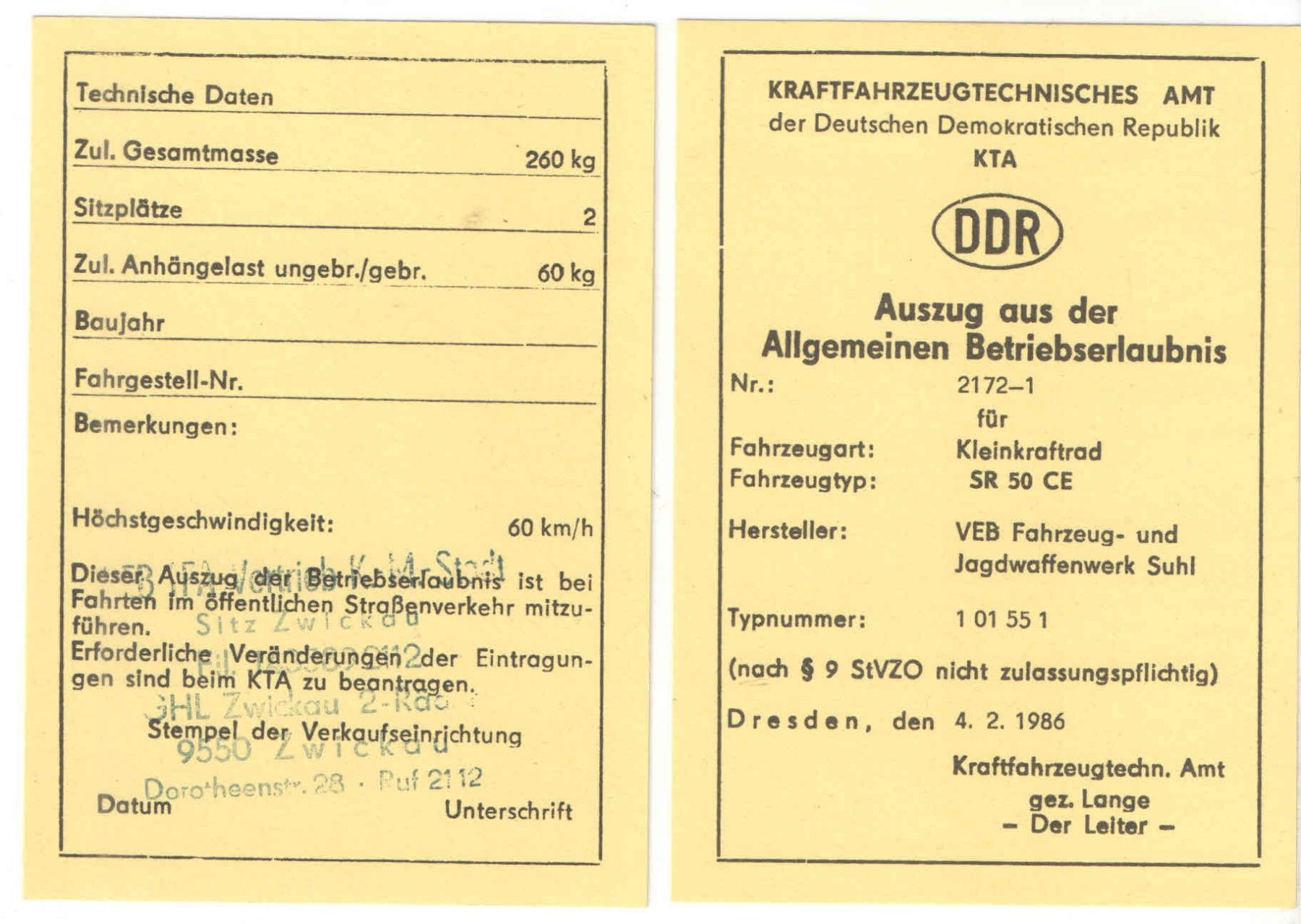 • Betriebserlaubnis für KR51/1, Stempel, Simson, DDR, Oldtimer