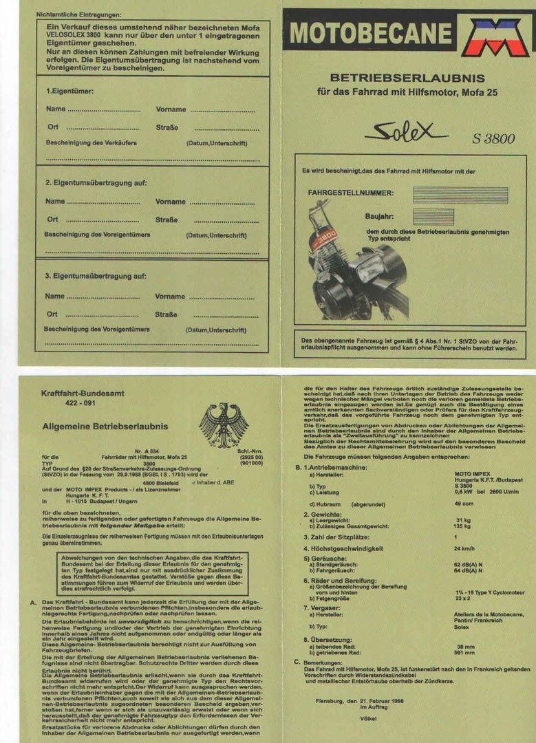 Betriebserlaubnis Solex Motobecane s 3800, Mofa , Fahrrad mit Hilfsmotor
