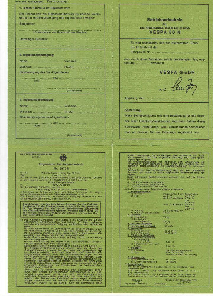 Vespa Betriebserlaubnis Vespa 50 N, ABE, Papiere, Kleinkraftrad, Roller