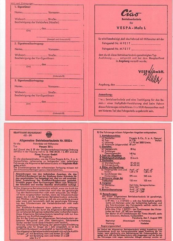 Vespa Betriebserlaubnis Vespa Mofa L TYP Ciao