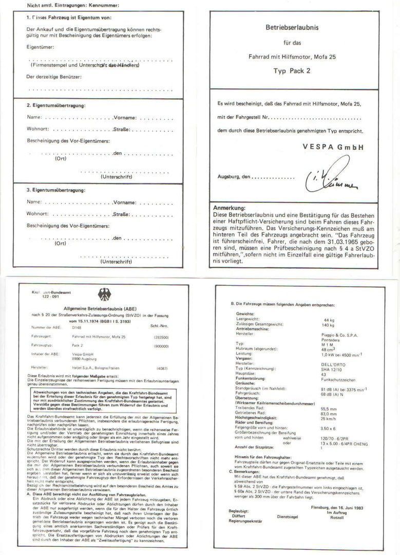 Vespa Betriebserlaubnis Vespa Typ Pack 2, Mofa 25, Fahrrad mit Hilfsmotor