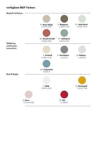 Weiß, Helle Minze, Rot (Reines Rot), Taubenblau, Dunkle Koralle, Salbeigrün, Perlweiß, Braun Beige, Ginstergelb, Dunkelgrau (Betongrau)