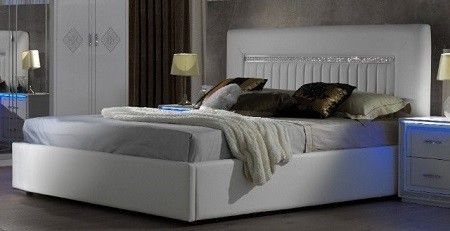 Im Lieferumfang enthalten: 1x Doppelbett mit aufwändig gearbeiteten Polster im Kopfteil mit aufwändig gearbeiteten Kopfteil Kopfteil mit Polsterung und Strasssteine Polsterung aus Kunstleder, ca. 5 cm Spanplatte Polsterbezug Die Lieferung erfolgt ohne Lattenrost und Matratze Auch als Stauraumversion