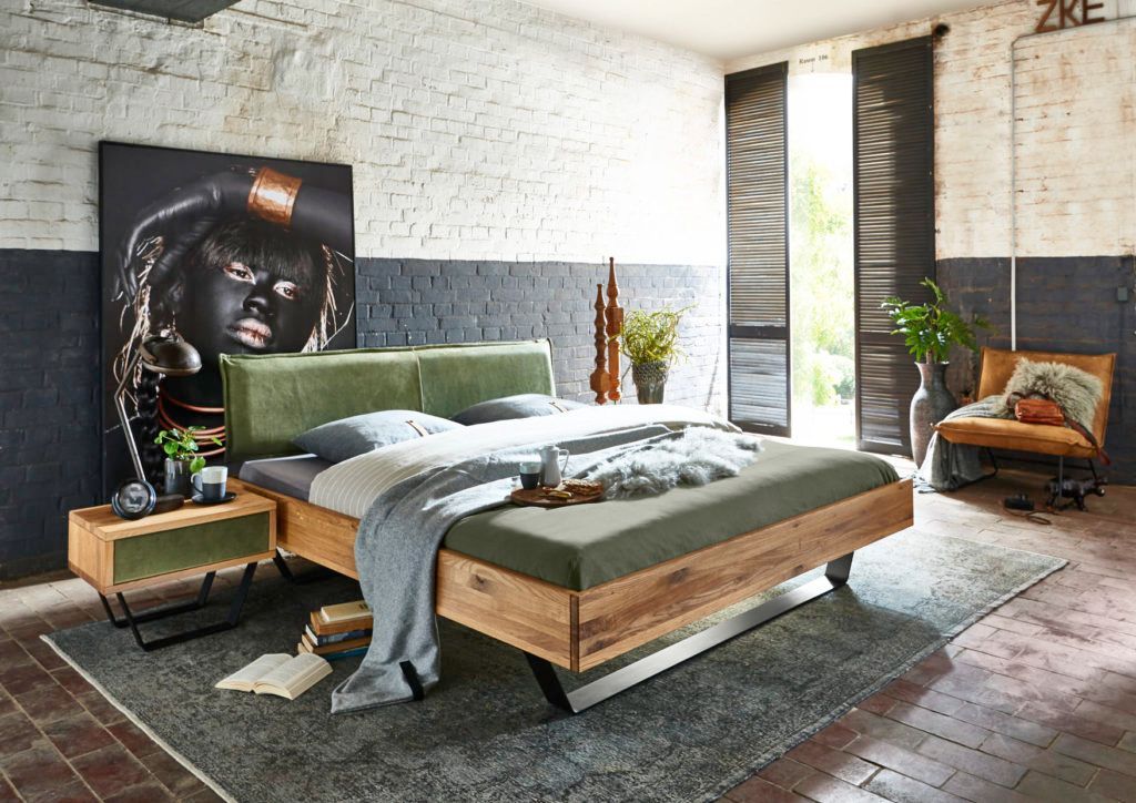 Bett Lemvig Sonderlänge 140x220 cm Wildeiche Polsterkopfteil Grün Metallkufen