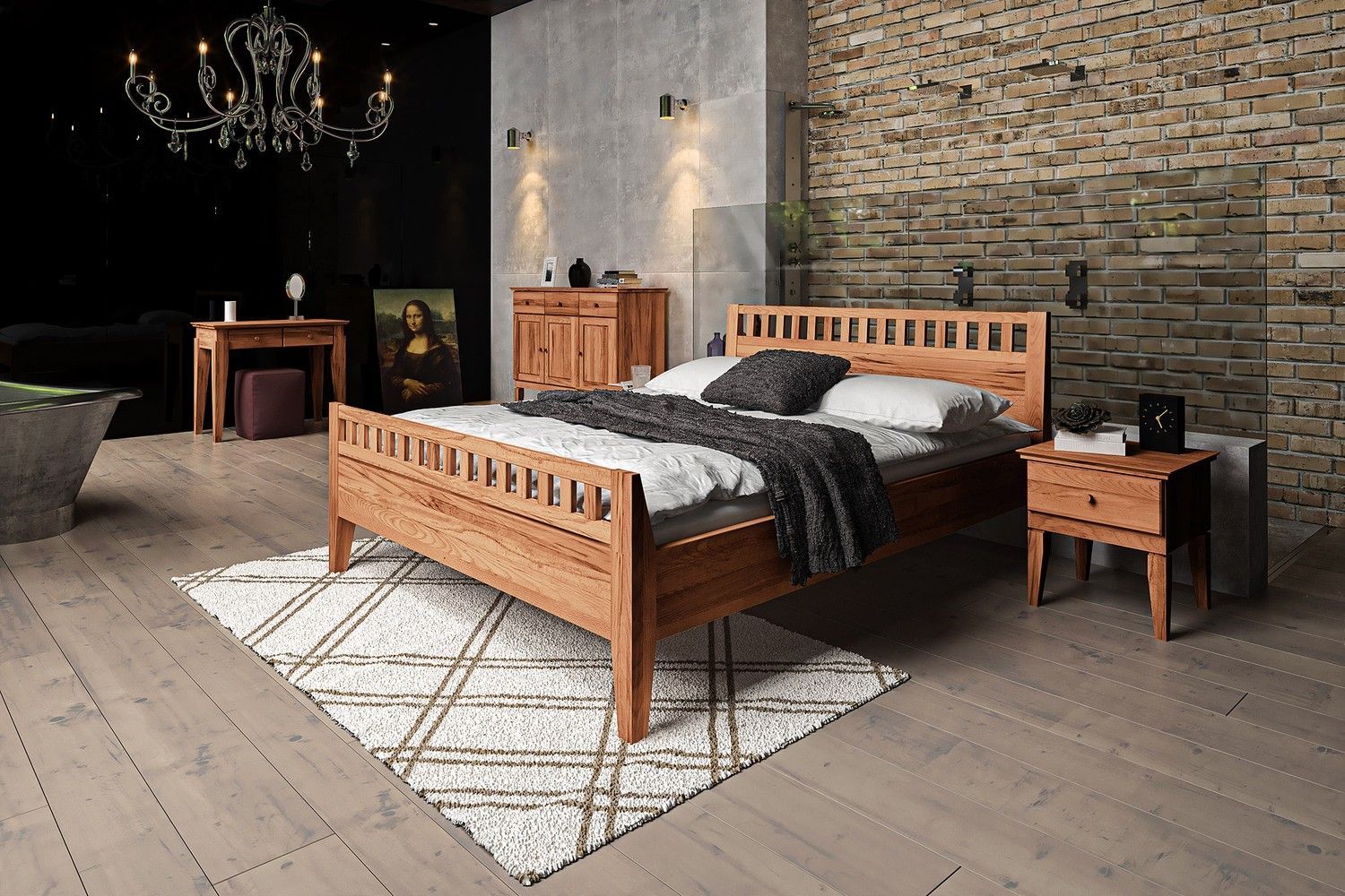 Bett Sydo 6 aus Kernbuche massiv 100x200 cm mit Holzkopfteil und hohem Fußteil
