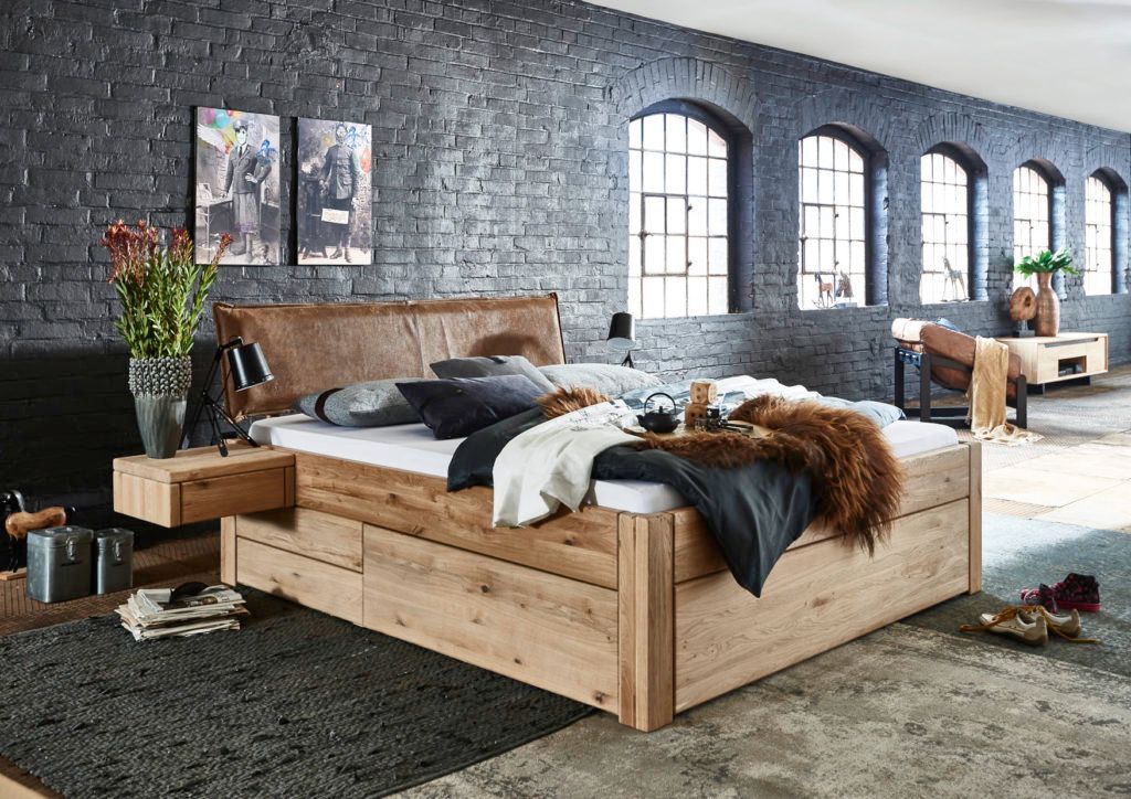 Bett Vejle 140x200 Wildeiche Bianco massiv mit Kopfteil 1 Schubkasten 2 Blenden