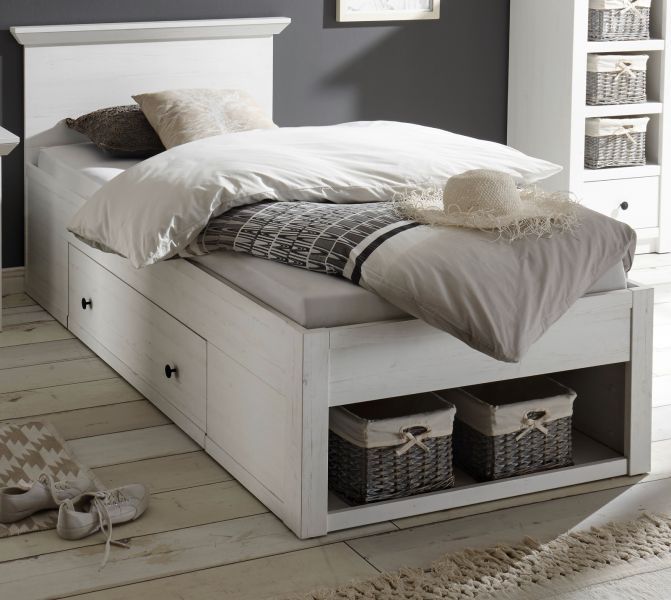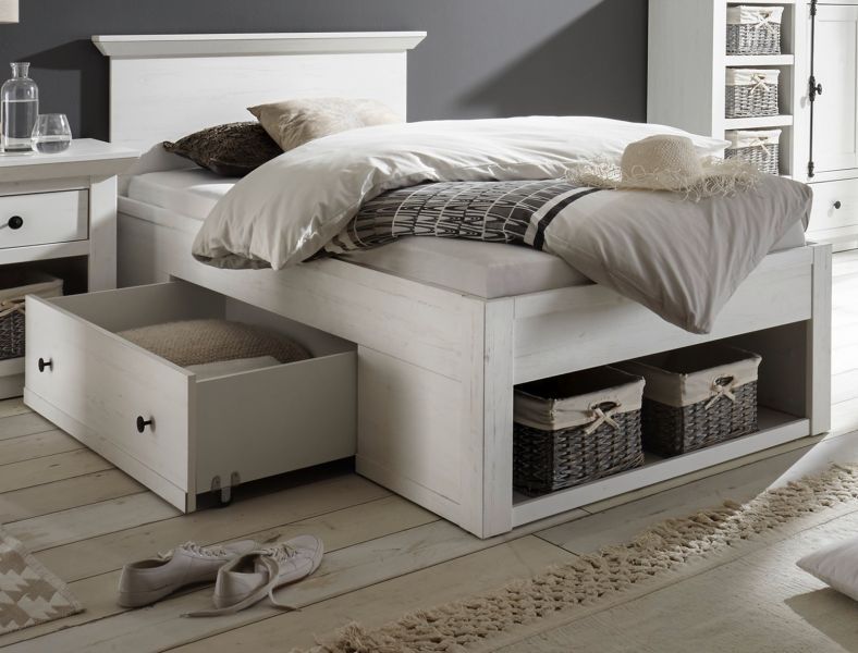 Bett weiß Pinie Landhaus Funktionsbett mit Schubkasten und Stauraum 90x200 Hooge
