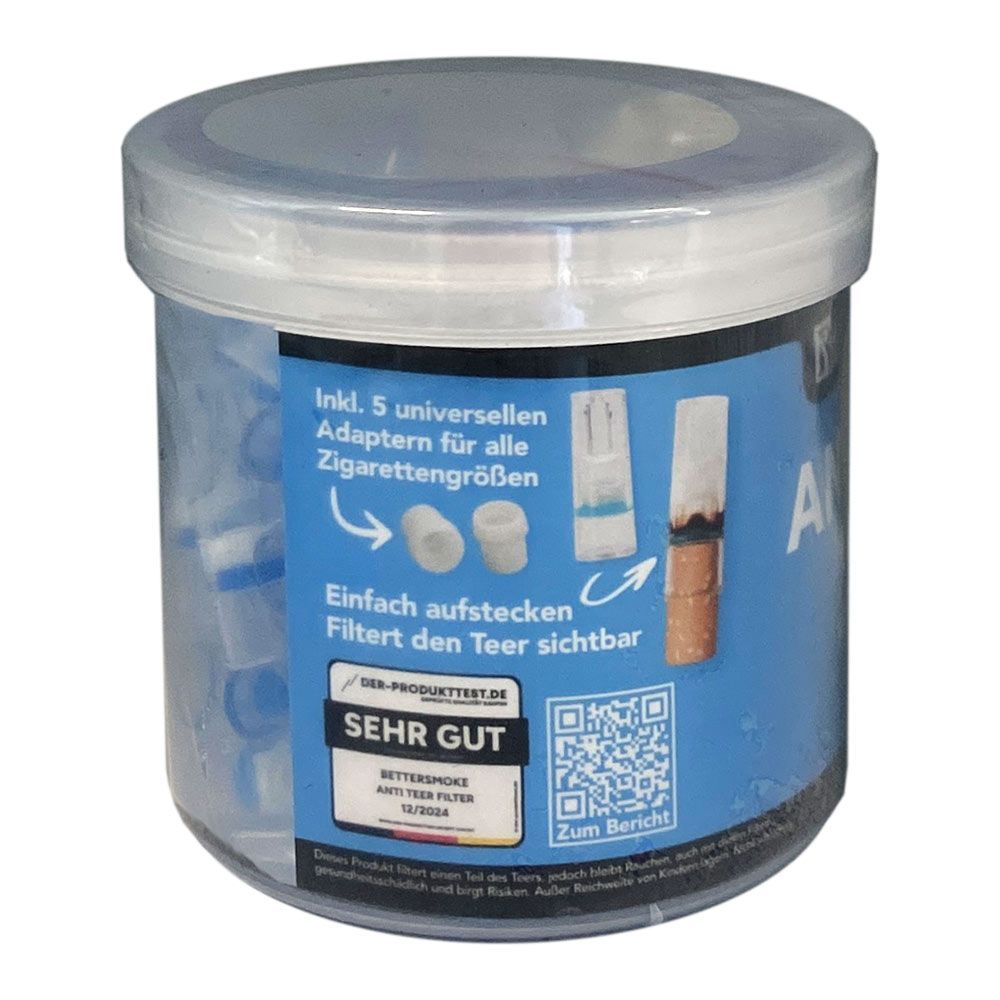 Bettersmoke Anti Teer Filter für Zigaretten 100 Stück Die Bettersmoke Anti Teer Filter - inkl. 5 universal Adapter für alle Zigaretten-Größen passend - eignen sich für Zigaretten mit einem Durchmesser von 7-8mm. Durch den universal Adapter, der ganz einfach an den Filter gesteckt werden kann, können