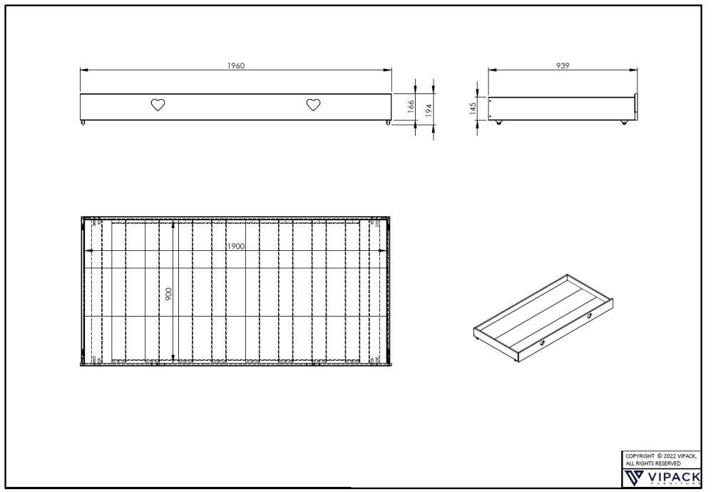 VIPACK Bettschublade zu Hausbett Amori 90x190 auf Rollen Stauraum Unterbettschublade