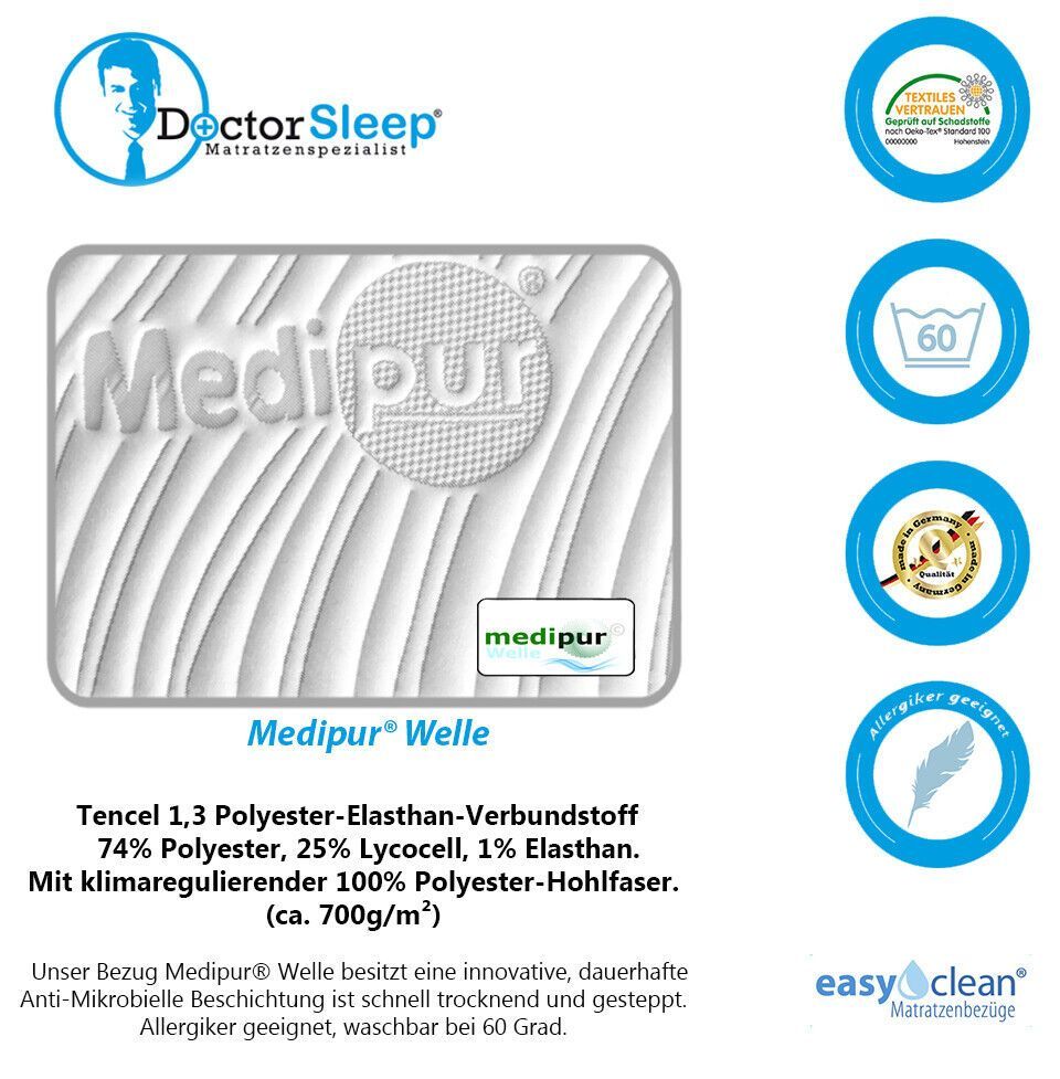 Günstige Bezüge bei Ihrem Matratzenspezialist Doctor Sleep® Bezug Medipur Welle! Maße: verschiedene Größen in Höhe 10cm, 12cm & 15cm Bezug: Farben und Muster können abweichen Seit 50 Jahren fertigen und verkaufen wir erfolgreich Bezüge aus hochwertigen Stoffen. Wir sind ein inhabergeführtes Fami