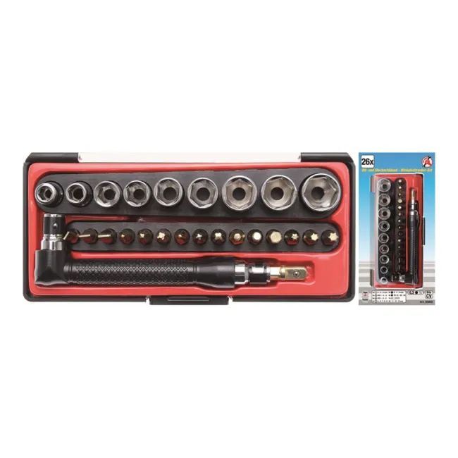 für Handbetrieb Lieferumfang: Bits, Abtrieb Schlitz 4 - 5 - 6 mm Bits, Abtrieb Kreuzschlitz PH1 - PH2 - PH3 Bits, Abtrieb Kreuzschlitz PZ1 - PZ2 - PZ3 Bits, Abtrieb Innensechskant 3 - 4 - 5 mm Bits, Abtrieb T-Profil (für Torx) T15 - T20 - T25 1 Bitadapter Steckschlüssel-Einsätze SW 5 - 6 - 7 - 8 - 9