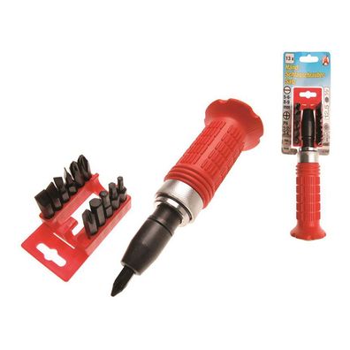Hand-Schlagschrauber zum Lösen festsitzender Schrauben wie z. B. an Kfz-Türscharnieren und Schlössern Griffstück mit Handschutz Lieferumfang: Bit, Antrieb 8 mm Sechskant, Schlitz 5 - 6 - 8 - 9 mm Bit, Antrieb 8 mm Sechskant, Kreuzschlitz PH1 - PH2 - PH3 - PH4 Bit, Antrieb 8 mm Sechskant, Innensechsk