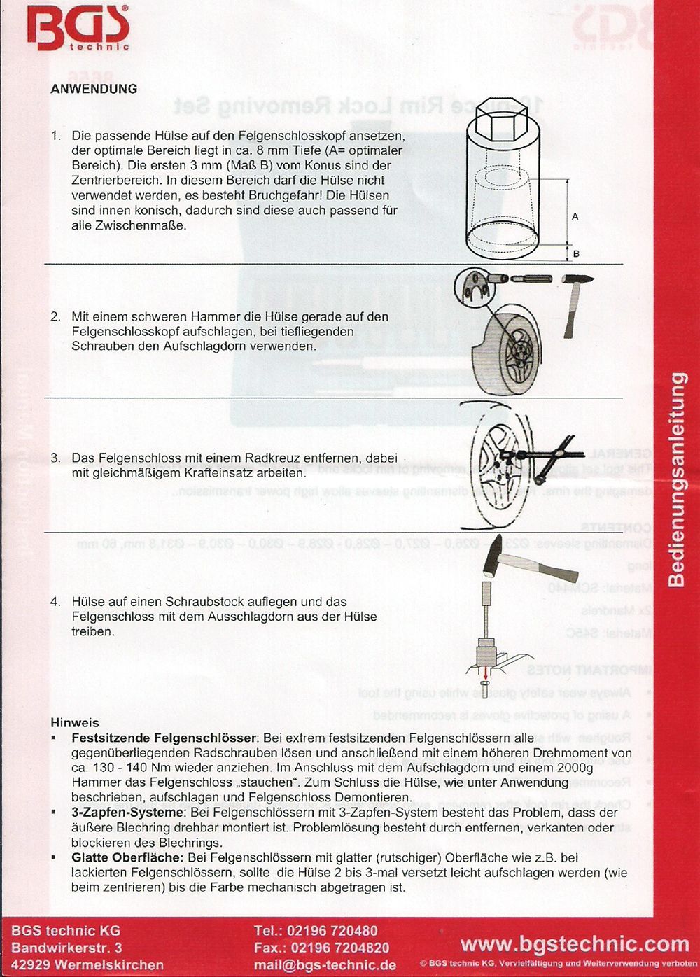 BGS BGS Felgenschloss Knacker Radschrauben Demontage Werkzeug Radsicherung öffnen