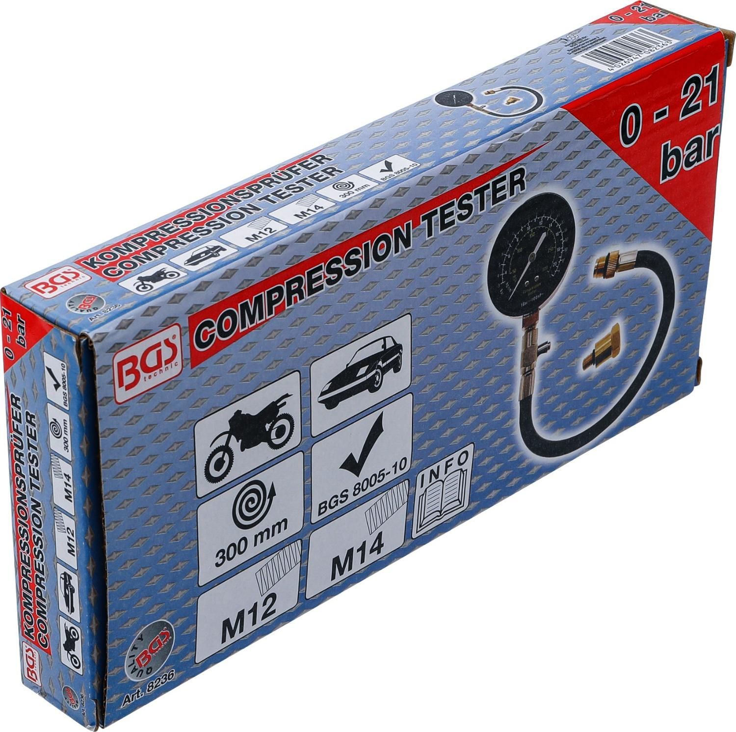 BGS BGS Kompressionstester M12 + M14 Benzinmotor Kompressionsprüfer 21 Bar