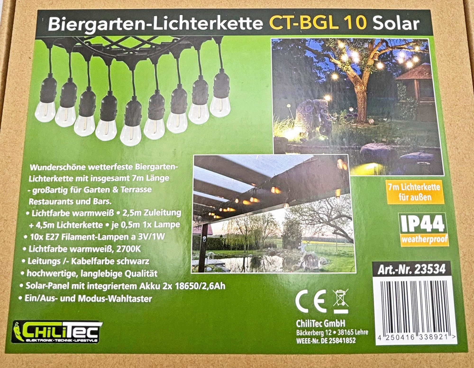 ChiliTec Biergarten-Lichterkette "CT-BGL 10Solar" 2m + 4,5m, 10x Filament Led Lampe, IP44