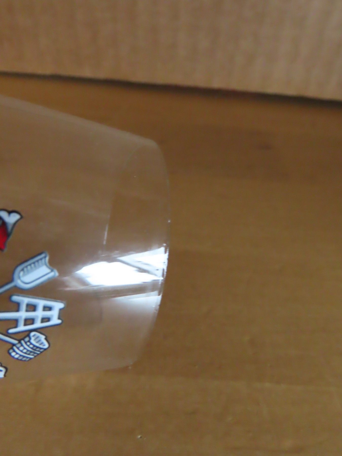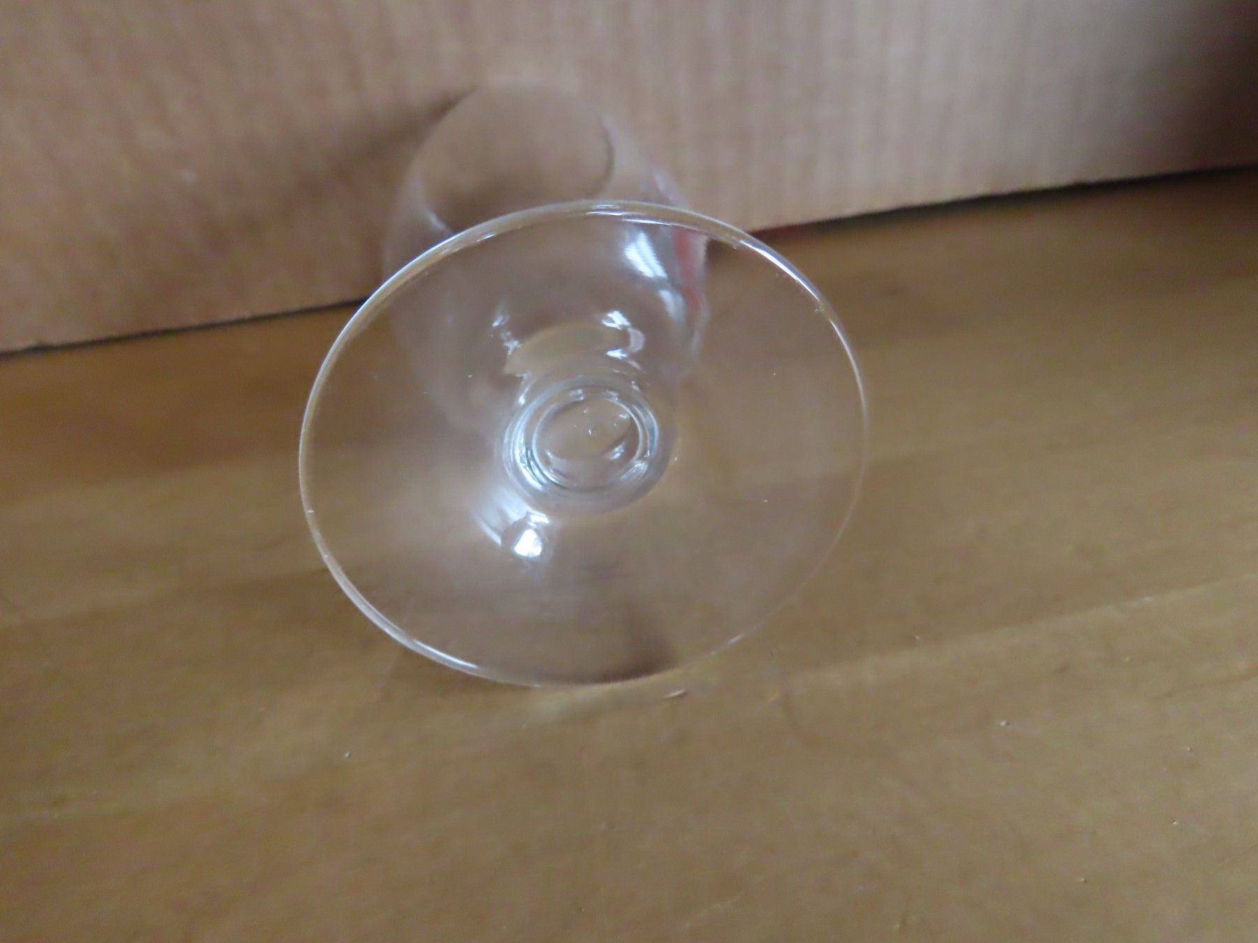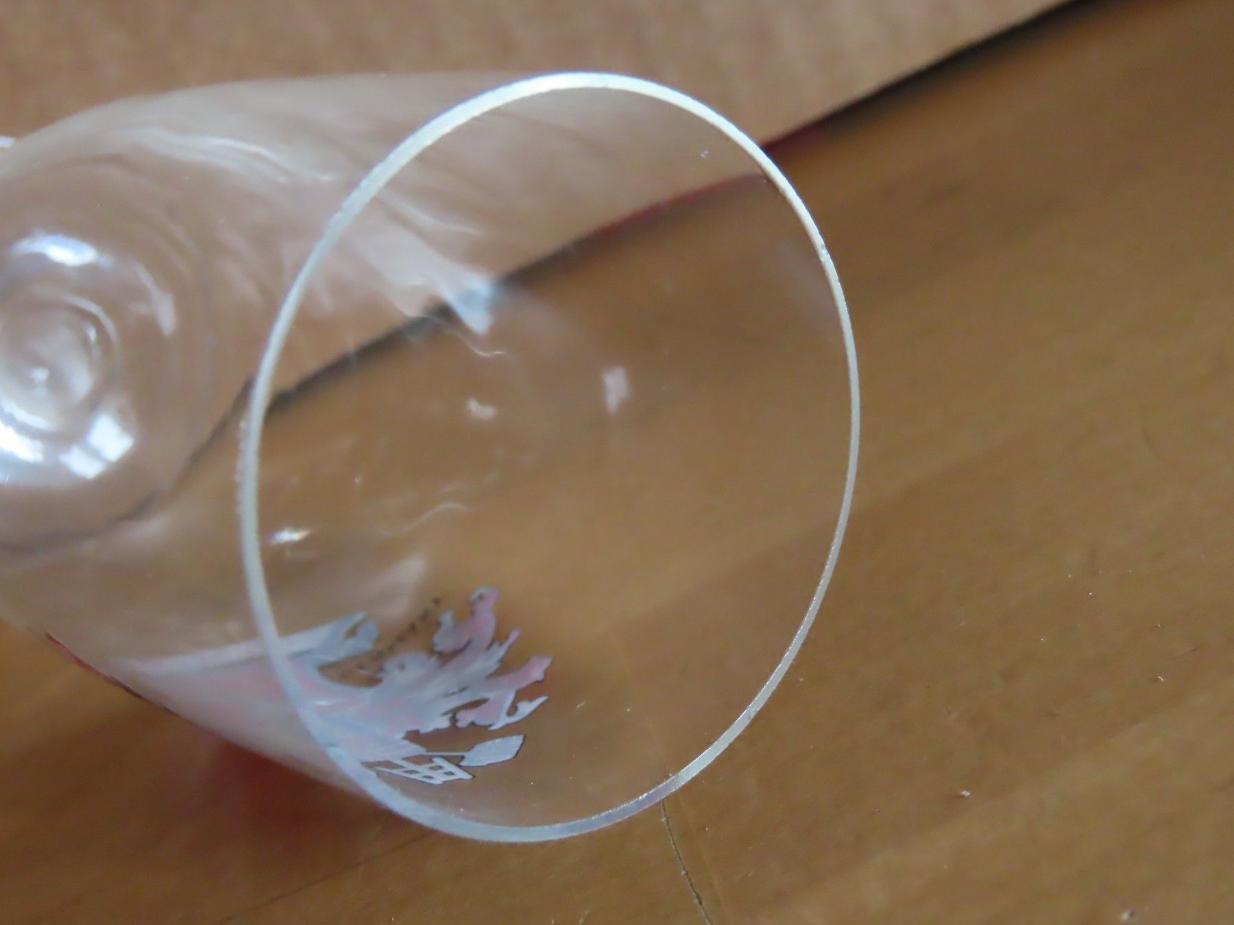 Maße: ca. 14,2 cm hoch, die Öffnung hat einen Durchmesser von ca. 4,7 cm die Standfläche hat einen Durchmesser von ca. 6 cm der Fuß ist ca. 3,5 cm hoch Motiv ist Druck Glasdicke ca. 0,5 mm Material: Glas ist leicht verschmutzt, hat am oberen Rand ganz feine Absplitterungen In der Spülmaschine könnte