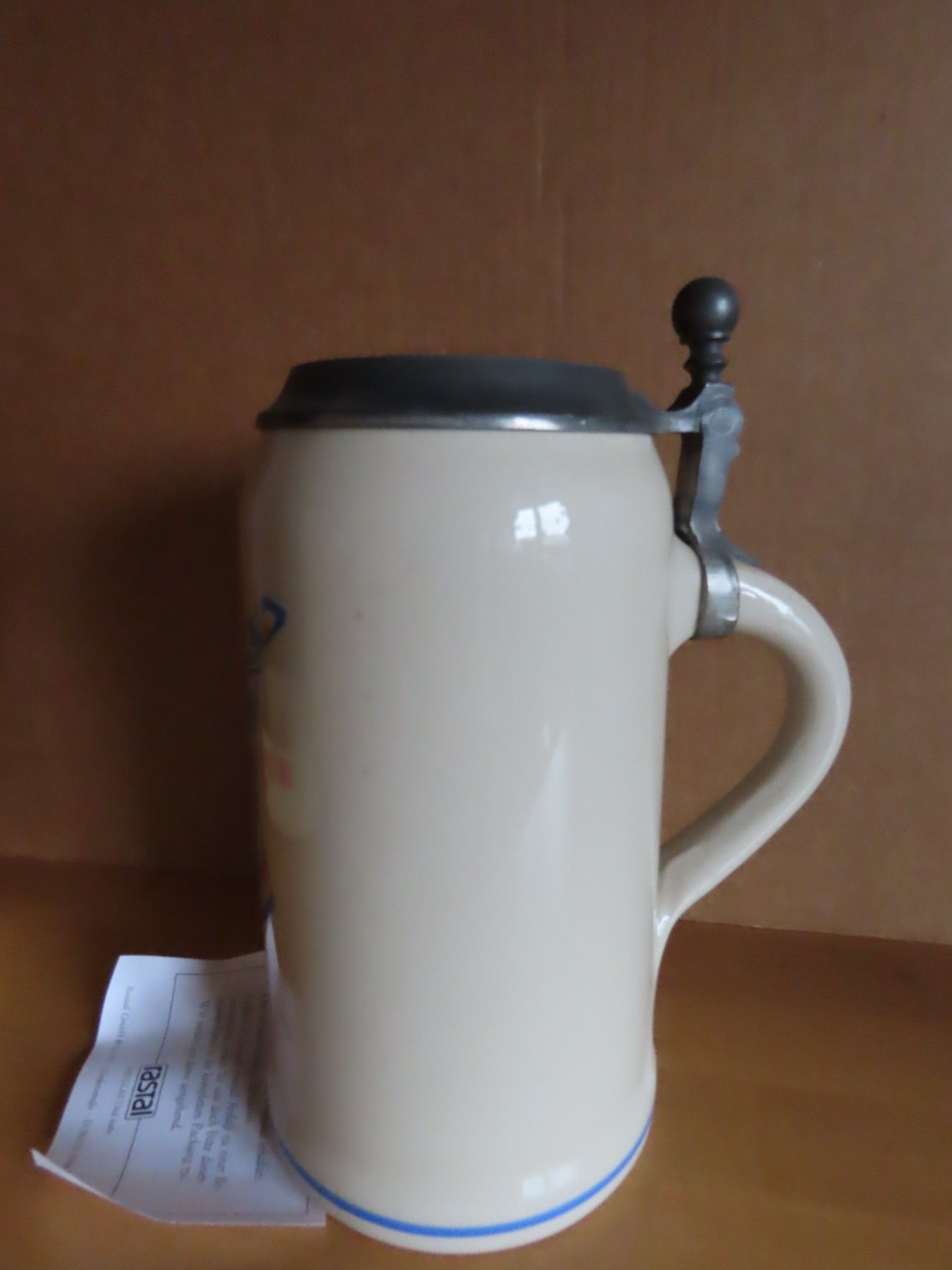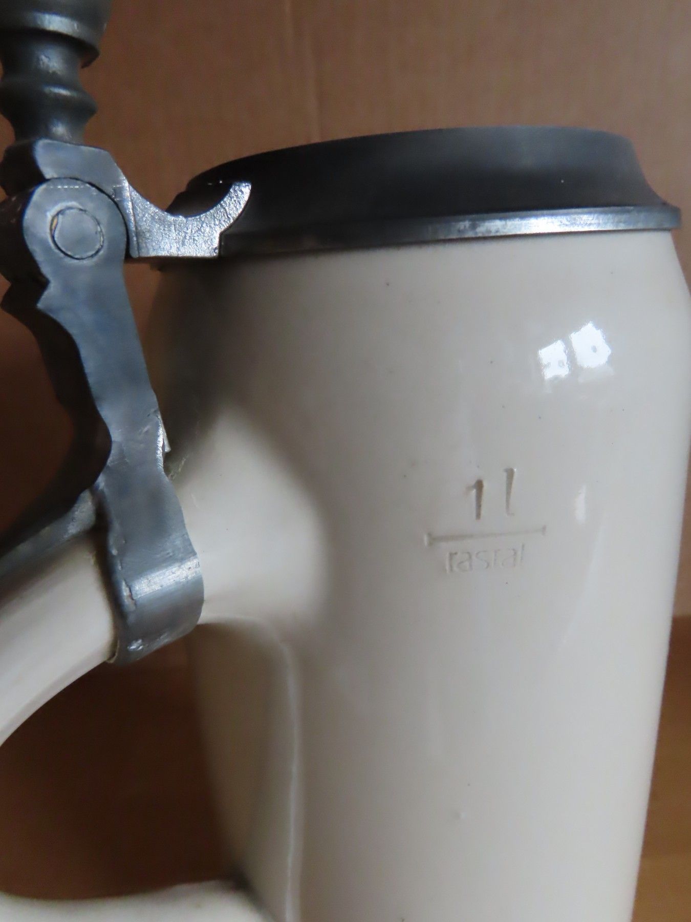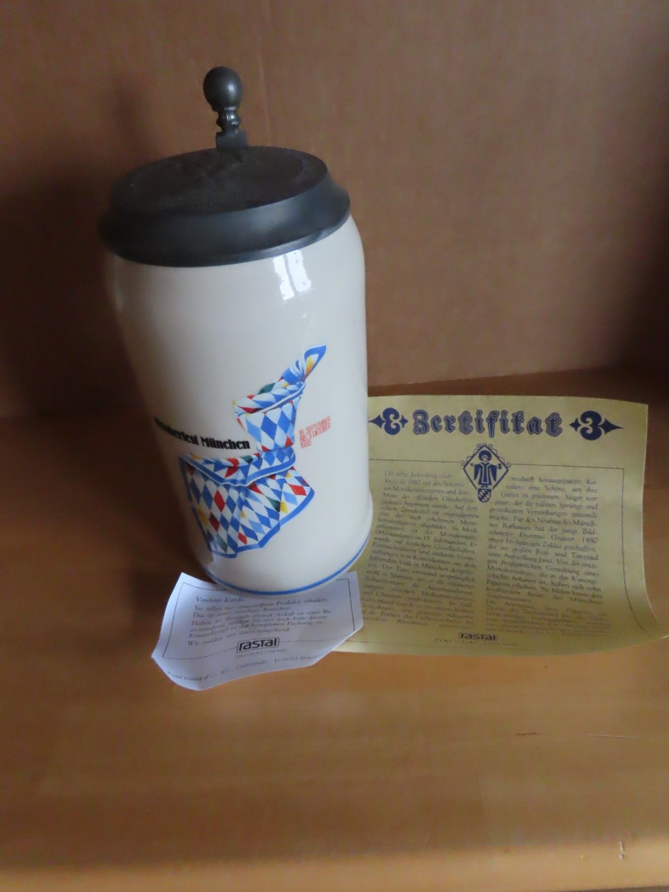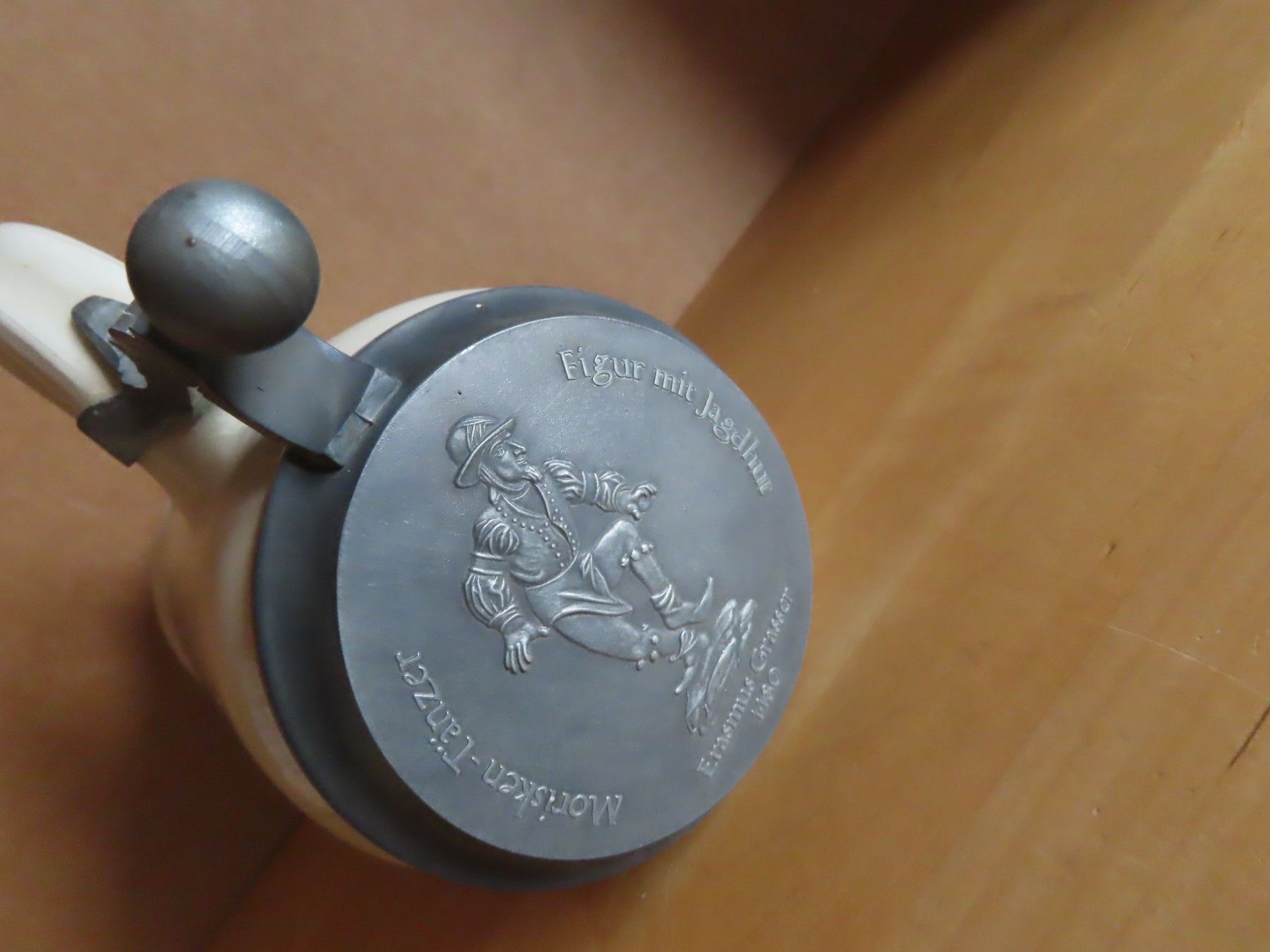 Morisken-Tänzer Figur mit Jagdhut Erasmus Grasser 1480 - Maße: ca. 19,5 cm hoch x ca. 9 cm am oberen Rand gemessen --der Boden Fuß hat einen Durchmesser von ca. 10 cm --immer die breiteste Stelle gemessen Material: Keramik-Zinndeckel ist leicht verschmutzt und Deckel hat Verfärbungen Morisken-Tänzer... Mehr