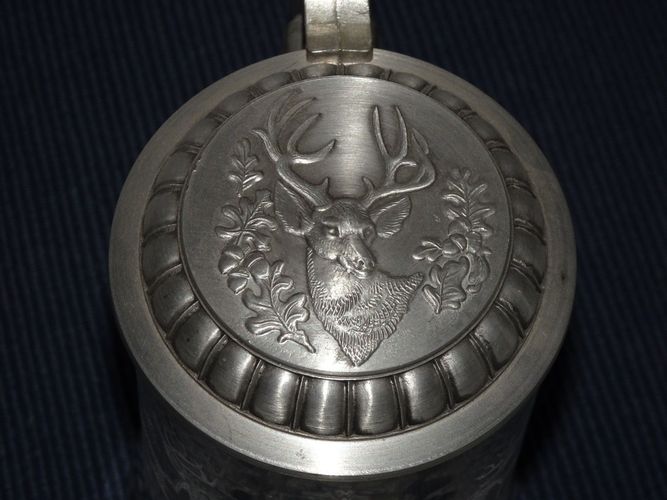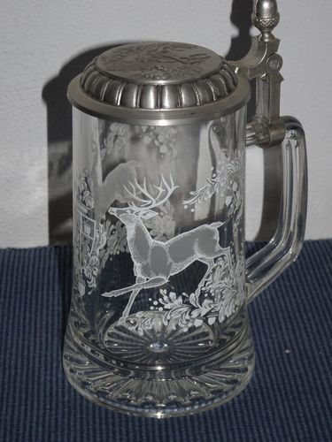 Bierkrug Glas mit Zinndeckel, Hirschmotiv