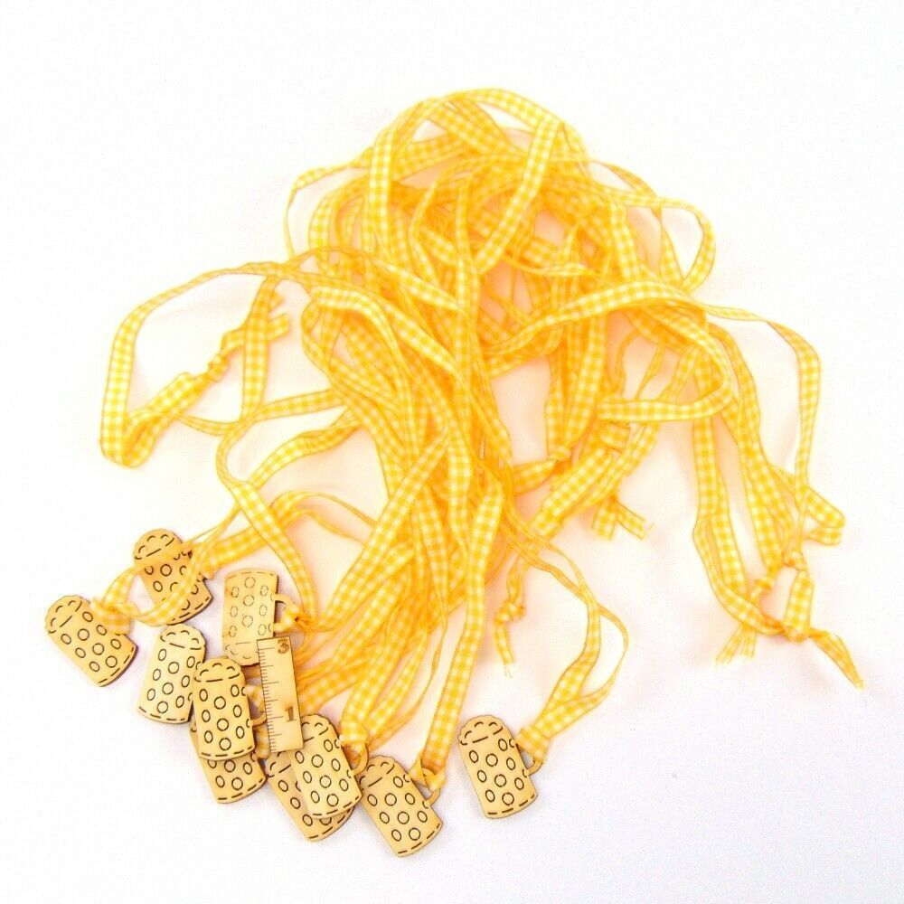 Bierkrüge, Maßkrug mit Schaum 10 Stück mit gelb kariertem Band. aus 3 mm Birken Sperrholz gelasert. Der Bierkrug ist 3 cm Hoch mit 90cm langem Band. Eignet sich gut zur Dekoration auf Geschenken oder als Kette für den Hals.