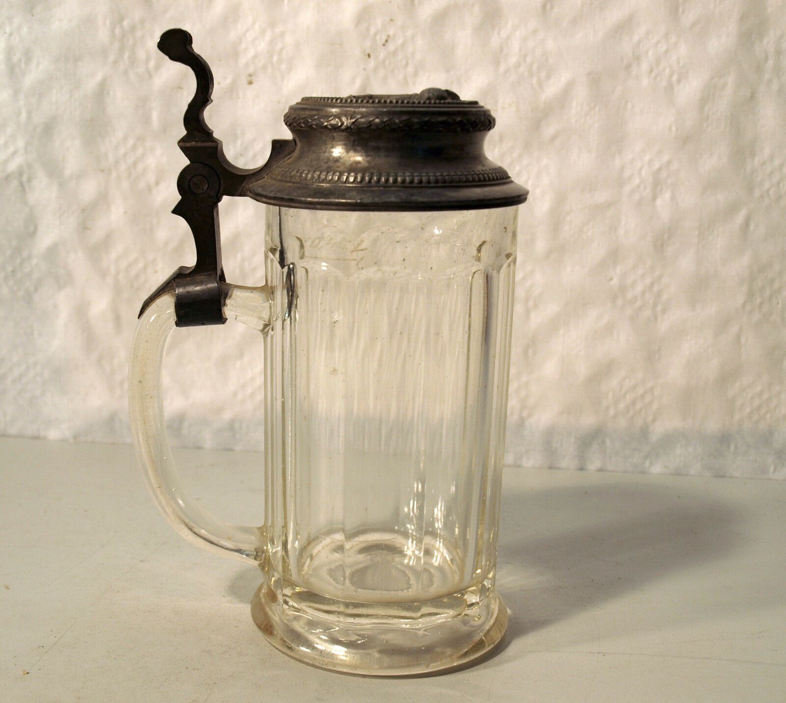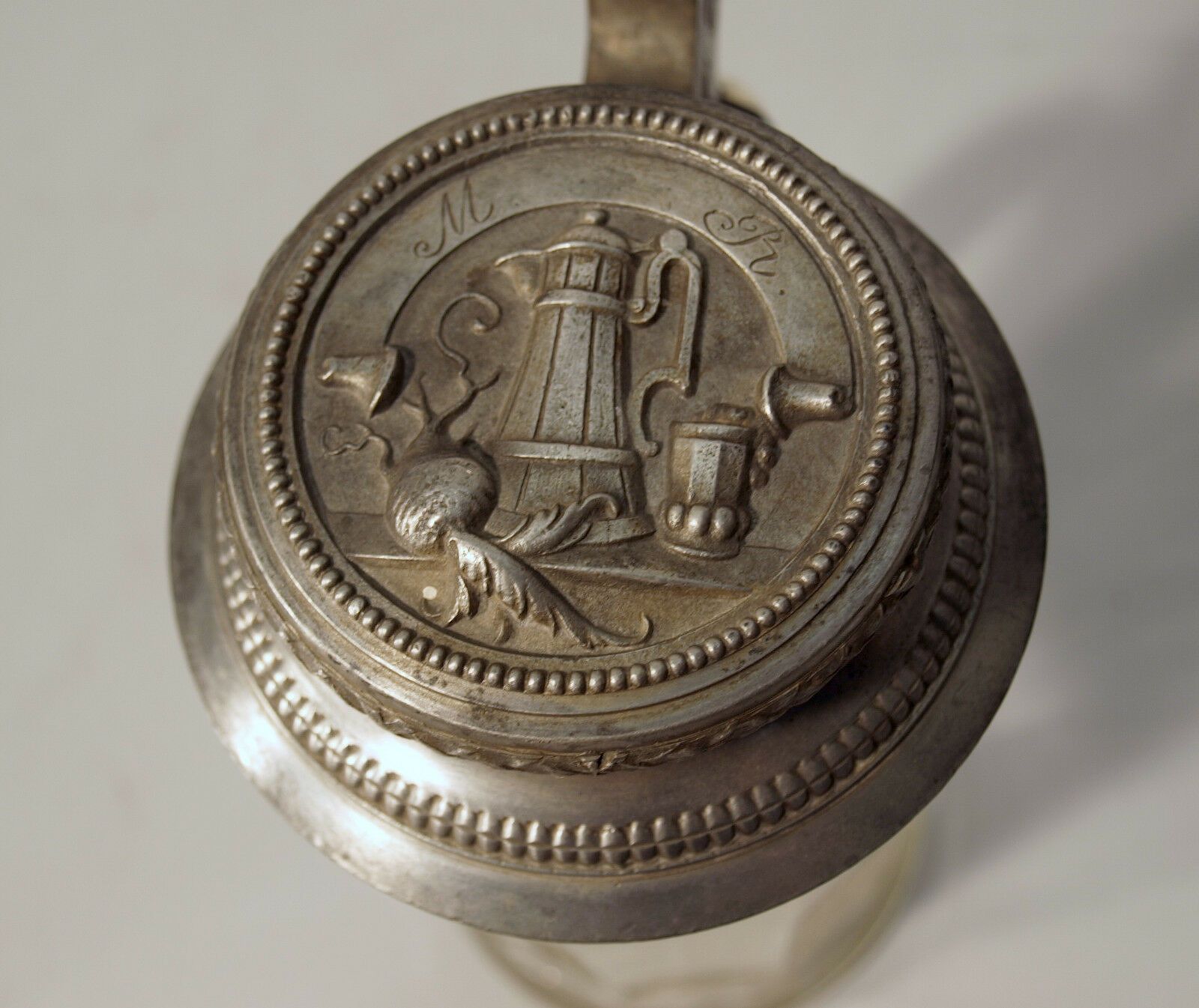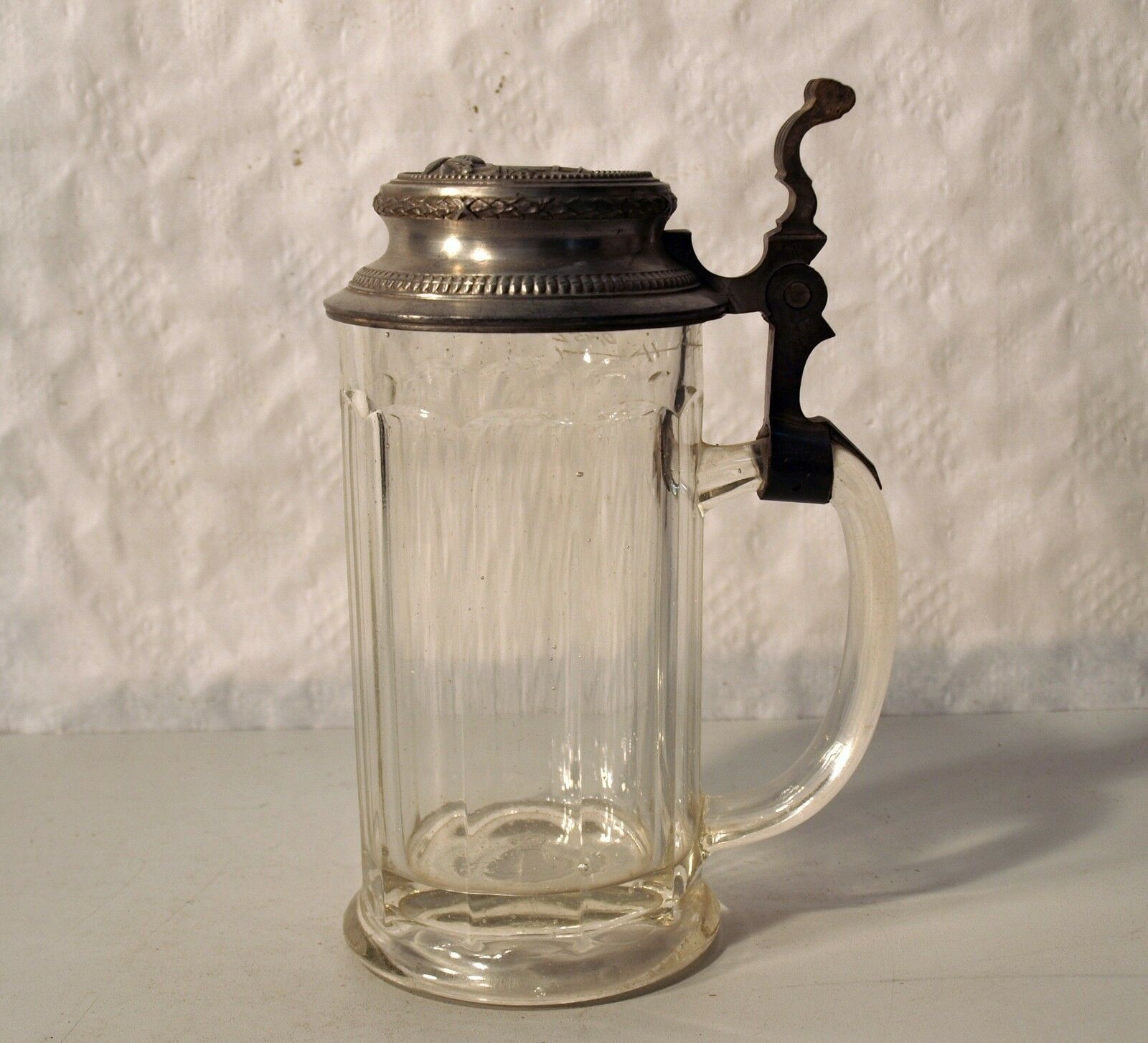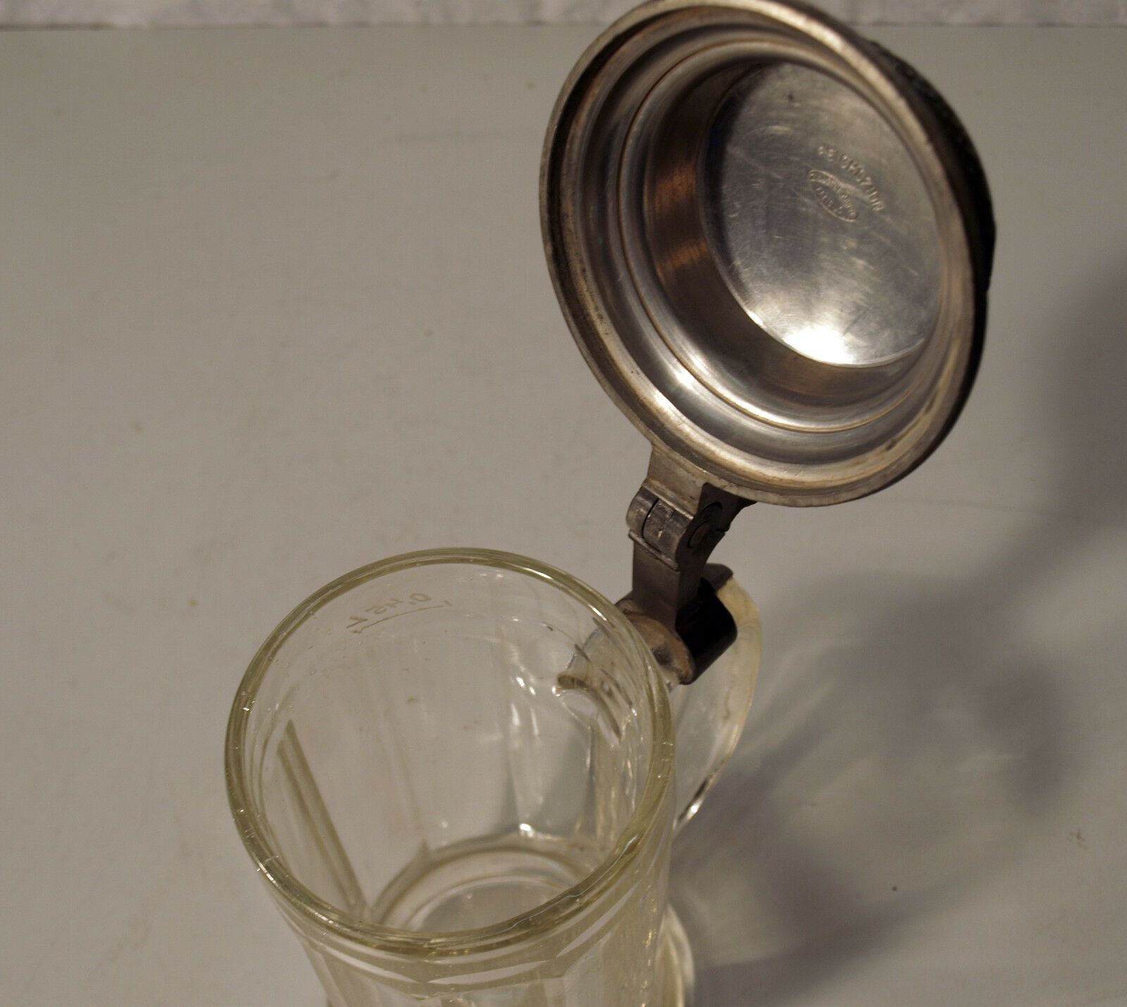 Bierkrug um 1900. Material: Pressglas mit Zinndeckel. Inschrift Deckel: M.R . (siehe Foto). Marke: Siehe Fotos. Maße: H 20 cm. Antikes am Deich - Inh: Oliver Kipp-Trense G M T Sprache erkennen Afrikaans Albanisch Arabisch Armenisch Aserbaidschanisch Baskisch Bengalisch Bosnisch Bulgarisch Burmesisch