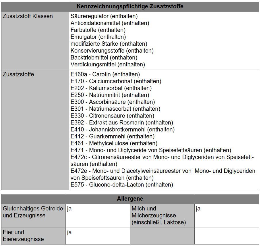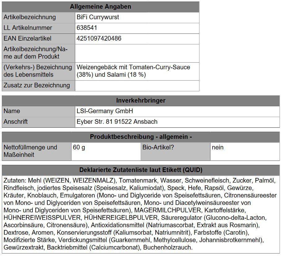 Inverkehrbringer Name LSI-Germany GmbH Anschrift Eyber Str. 81 91522 Ansbach Zutaten Zutatenliste Zutaten: Mehl (WEIZEN, WEIZENMALZ), Tomatenmark, Wasser, Schweinefleisch, Zucker, Palmöl, Rindfleisch, jodiertes Speisesalz (Speisesalz, Kaliumiodat), Speck, Hefe, Rapsöl, Gewürze, Kräuter, Knoblauch, E... Mehr
